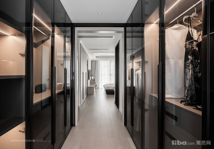 玻璃衣橱具有超大的收纳功能,让拿取衣物一目了然。在柔和的灯光下,女主人的服饰明艳动人,熠熠生辉。