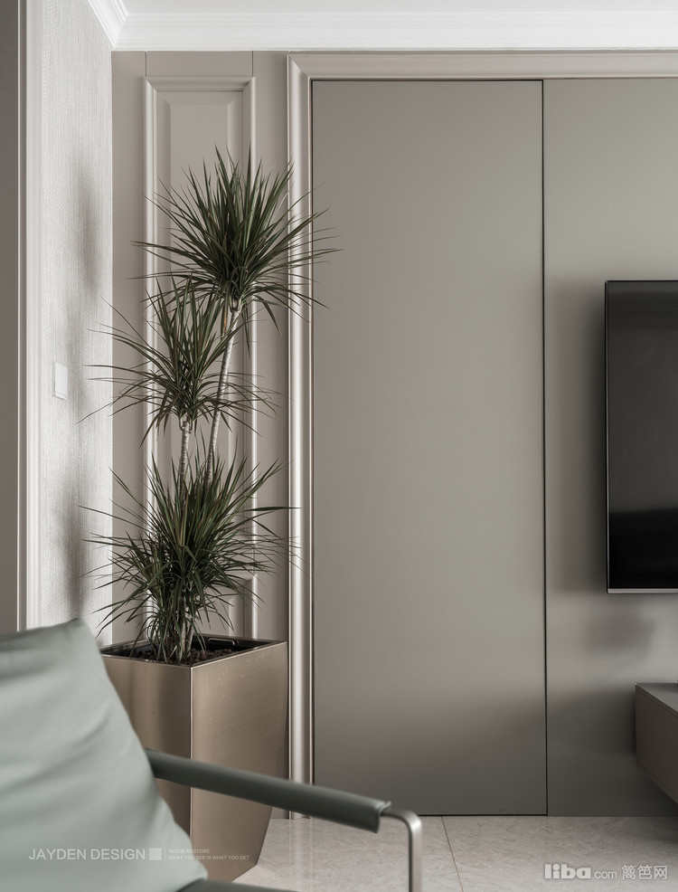 隐形门融入整体背景墙,用细腻的皮革来做硬包处理,手感如婴儿肌肤般丝滑。