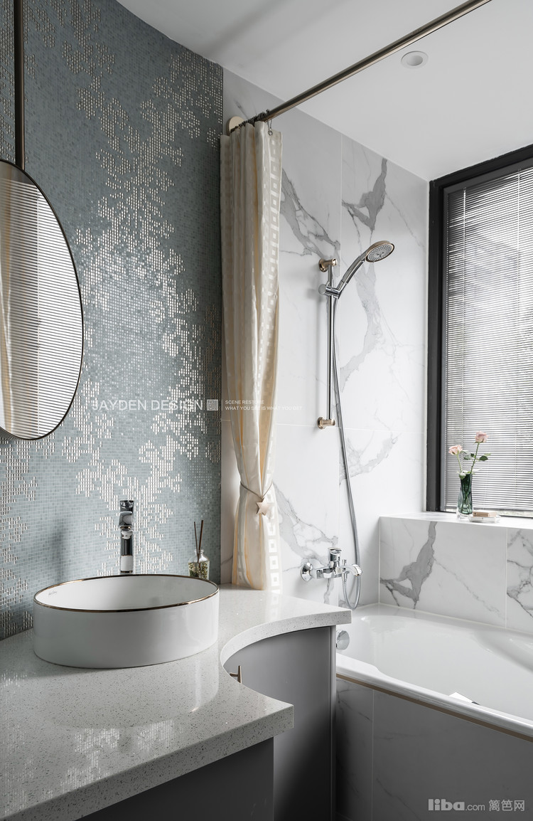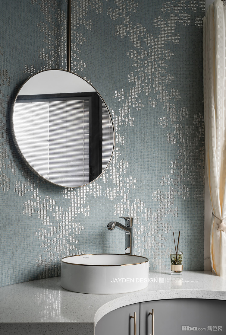 主卫雾霭蓝和银色拼花的马赛克弧形墙面,搭配一款复古圆镜,清新浪漫的气息扑面而来。科勒的高端系列智能一体式马桶和汉斯格雅龙头花洒,全部点缀有玫瑰金元素,和台盆很好的呼应。