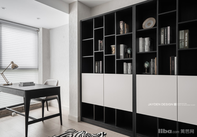 书房主要是男主人办公的区域,两组黑白色的书柜,给人简洁明快的视觉感受。整面的落地窗搭配了一款白色百叶帘,温馨而明亮的氛围很是惬意。