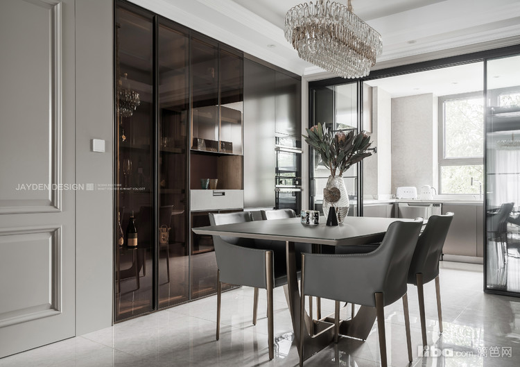设计师为餐厅配置了一组高柜,金属质感的封闭柜门加茶色玻璃门的组合对应了收纳和展示的不同功能。