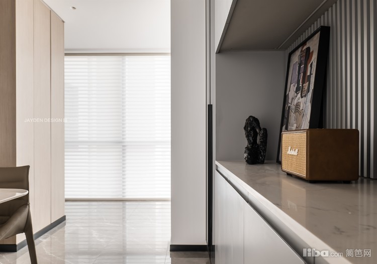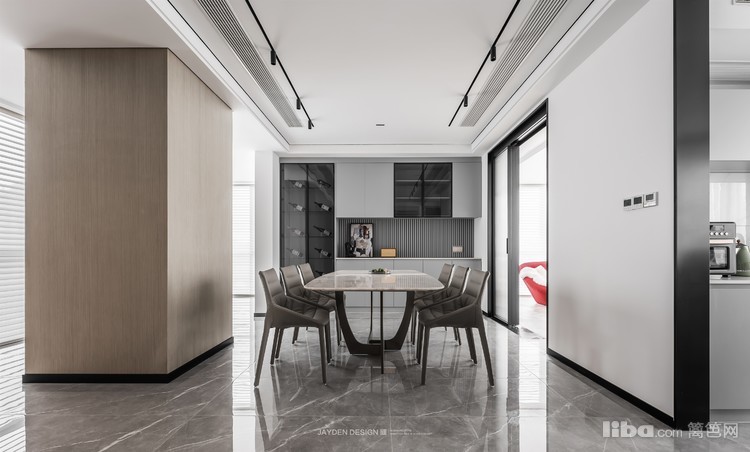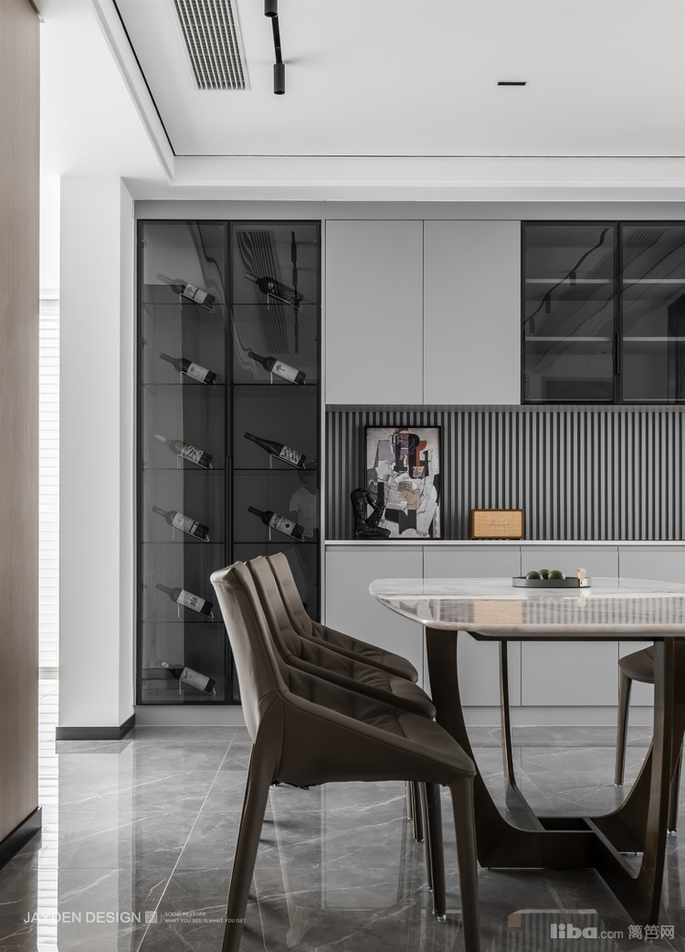 酒柜和餐边柜形成组合柜,高级灰的柜门和黑色玻璃结合,尽显绅士般的格调和质感。