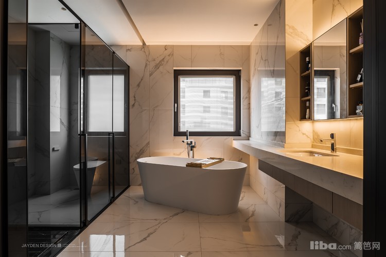 超大的主卫足足占据了一间卧室的空间,双台盆+浴缸的配置,加上独立马桶间和淋浴间,实现了星级酒店的三分离格局。