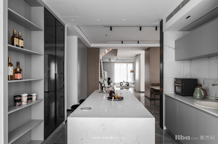 西厨位于一层的北边,同样是整面的落地窗,向外的视野非常开阔,向内可穿透餐厅直达最南面的会客厅。