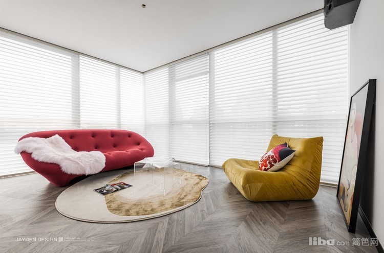 休闲客厅完全不同于正式会客厅,纯白的主色调包容下,是摩登的色彩碰撞。