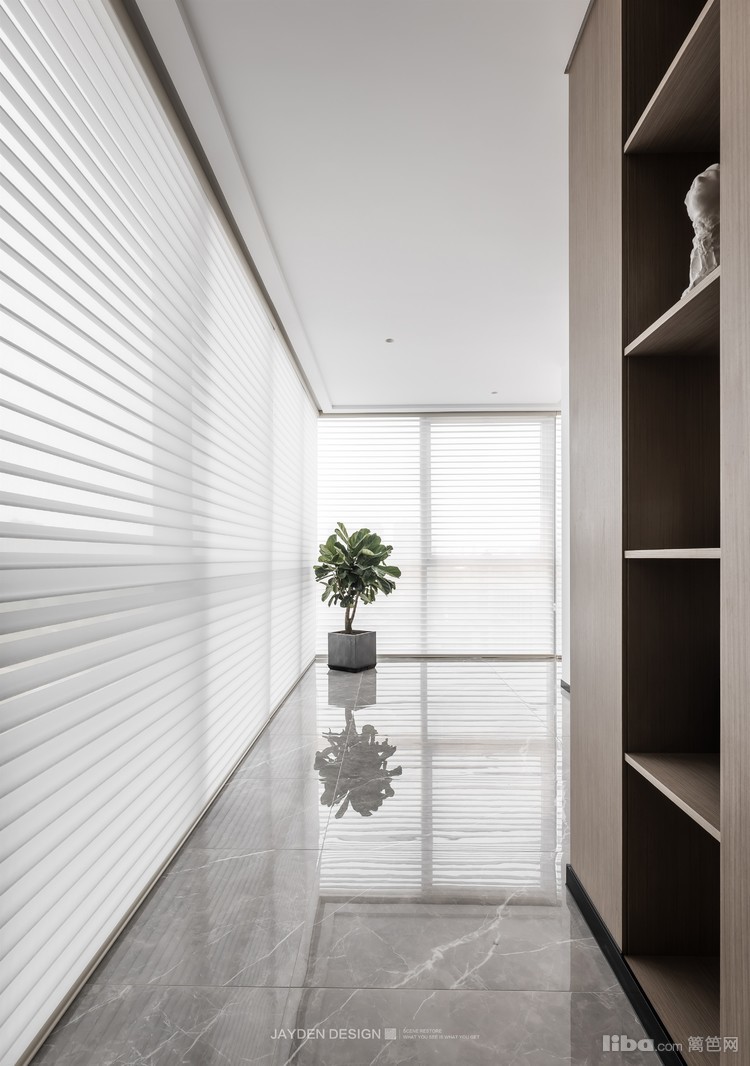 一面是纯净的蓝天,一面是百叶帘过滤出的曼妙光影长廊,体验与天空一窗之隔的空灵与轻盈。