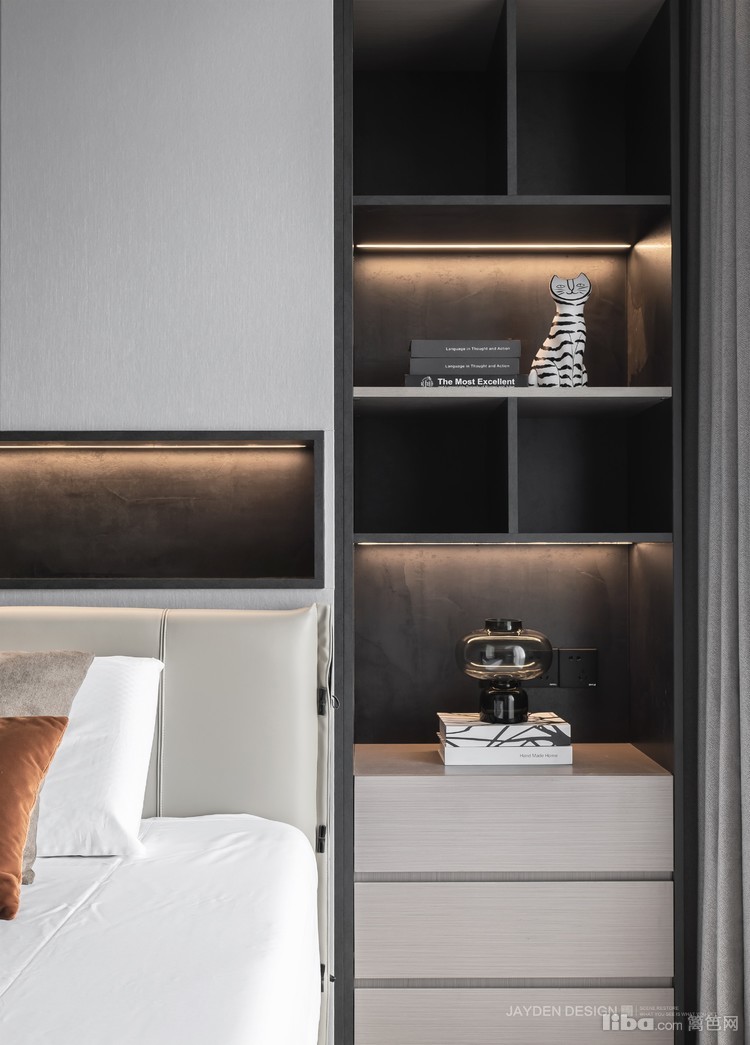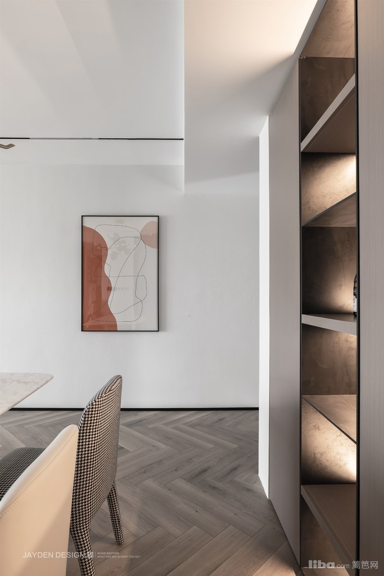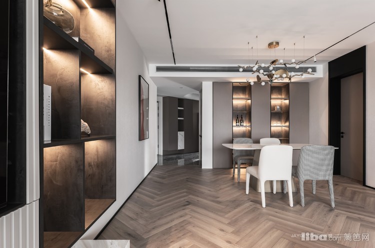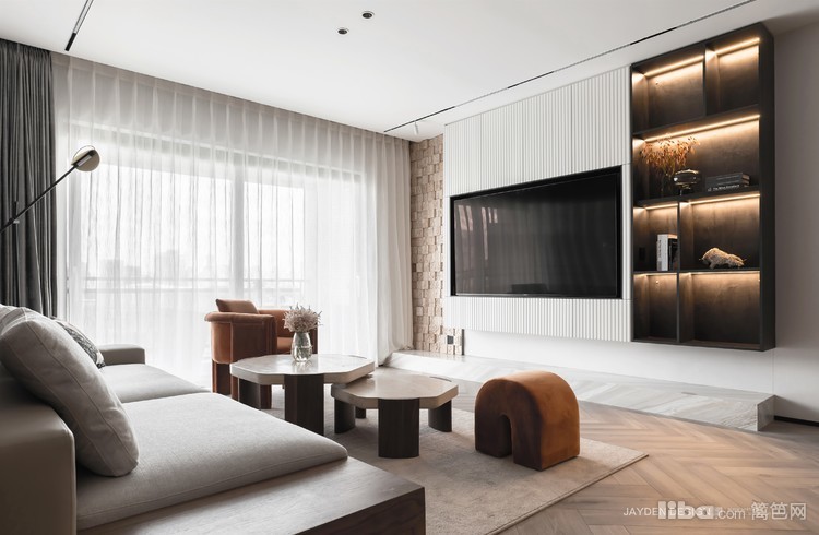 电视被嵌入悬挑式的收纳+展示柜,不会感觉太厚重,黑与白的搭配也更显干练与简洁。