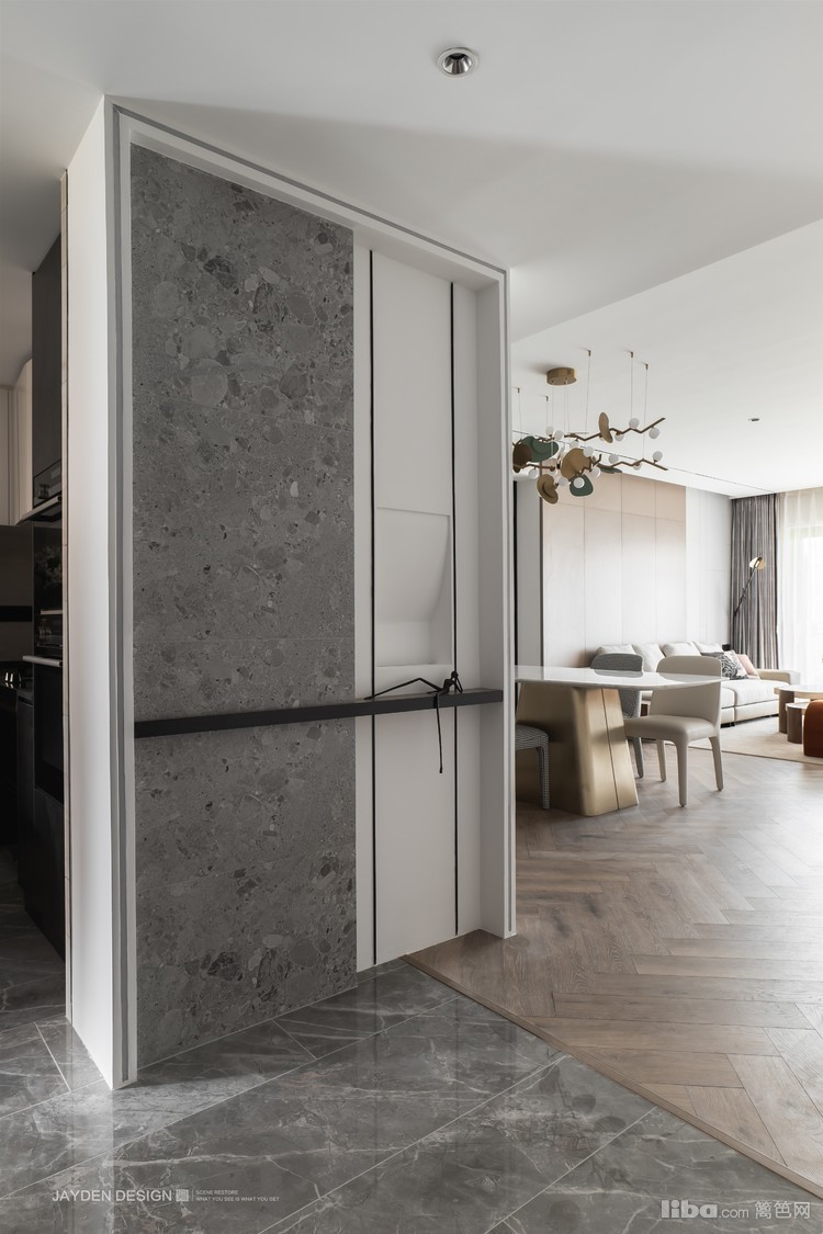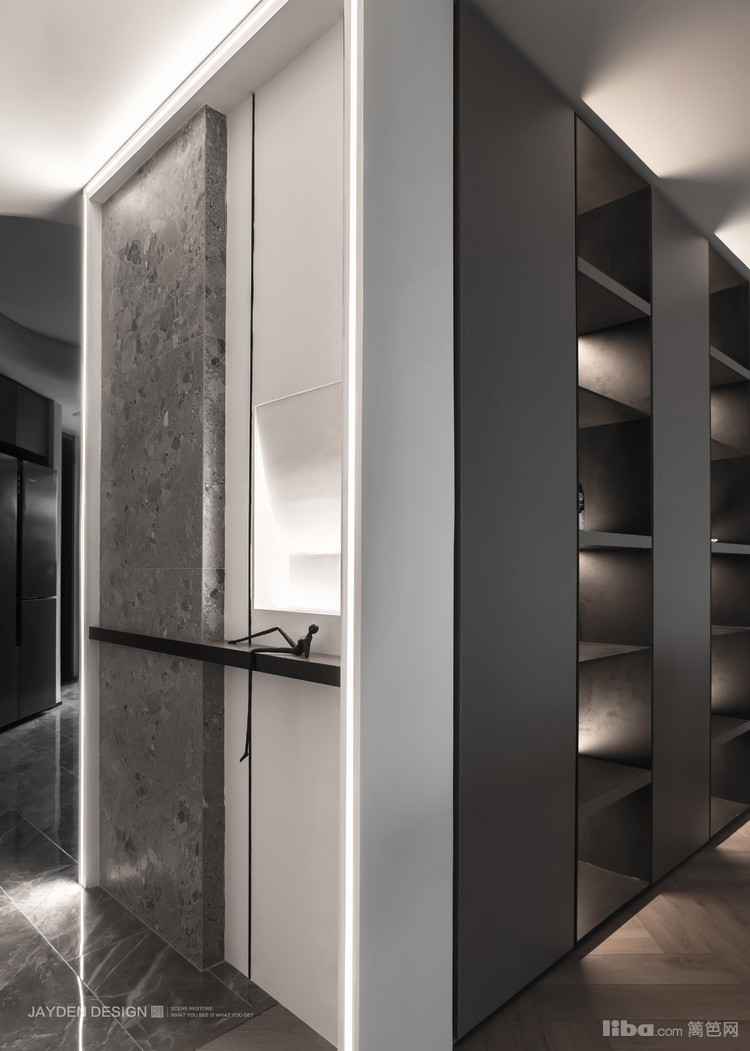 玄关使用了水磨石辅以简洁的造型,加入了线性灯光的装点,凸显出满满的仪式感