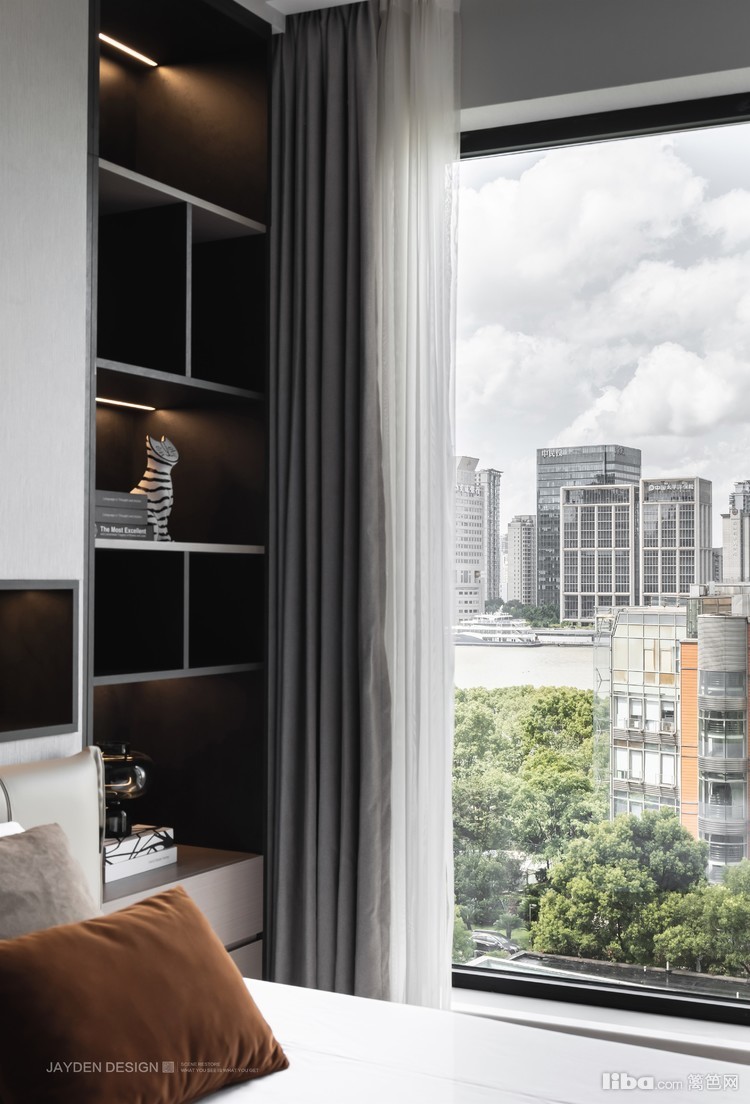 床头位置原本为倾斜的墙体,拉平的同时把收纳运用到极致。落地窗将浦江美景尽揽眼底。