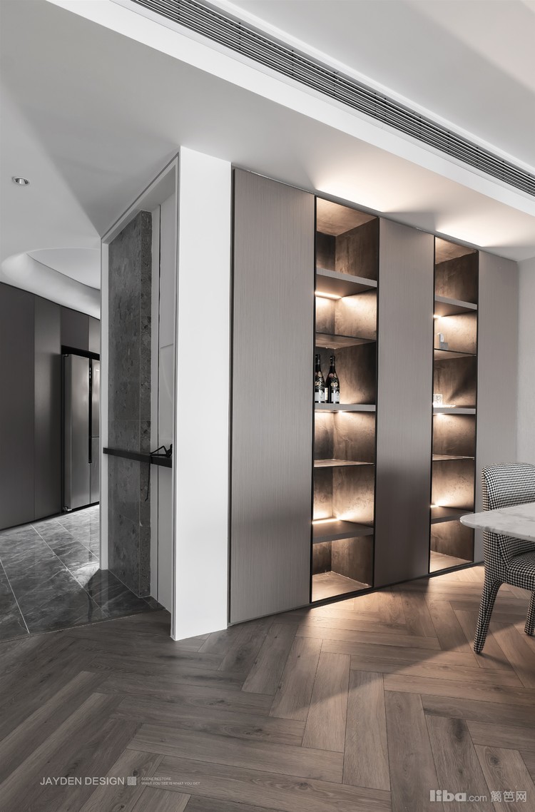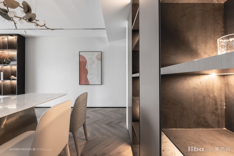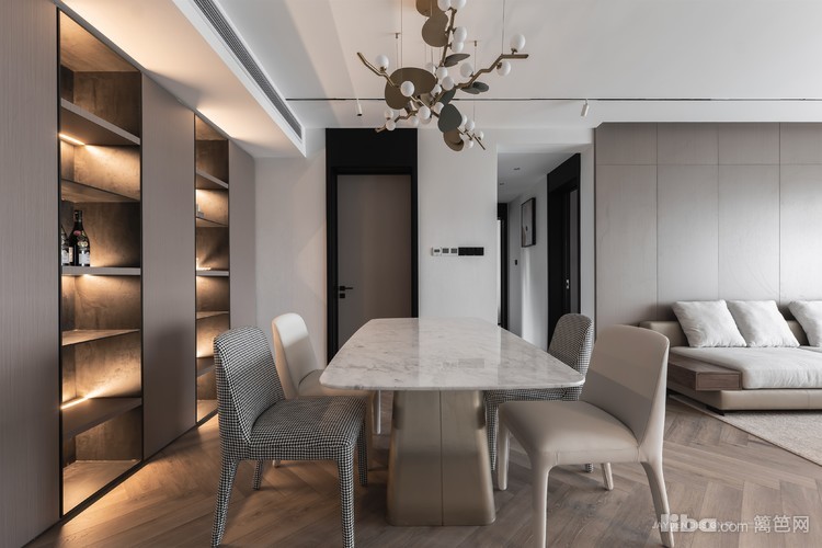 意式大理石餐桌,内嵌顶天立地的餐边柜,加上灯光的烘托,让餐厅充满仪式感。