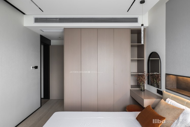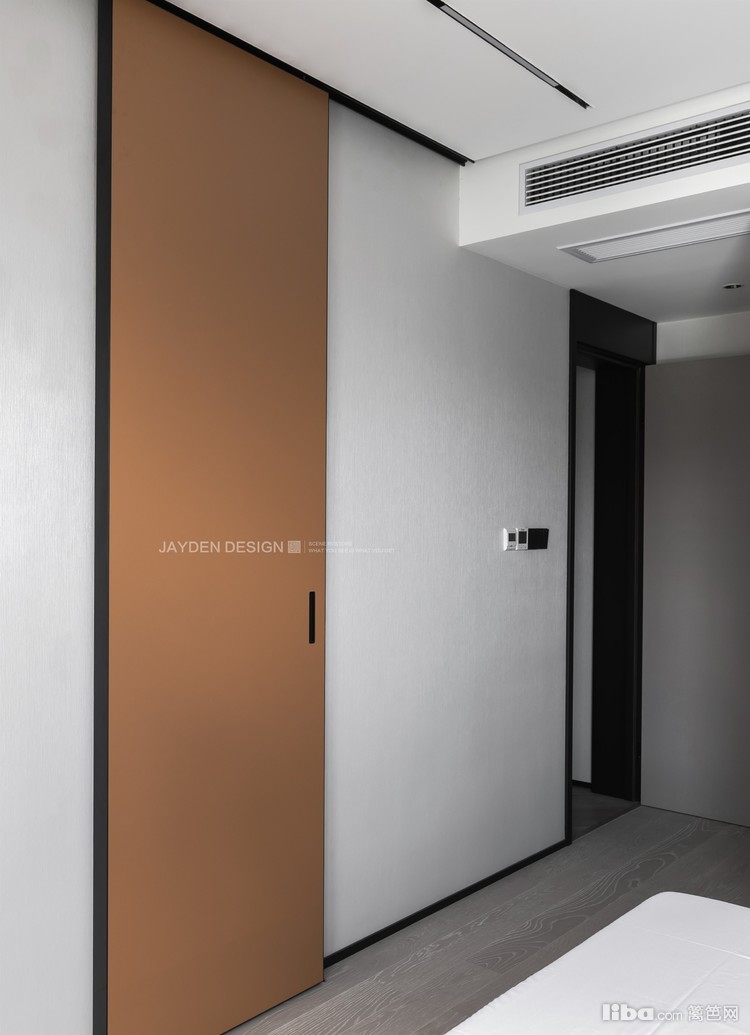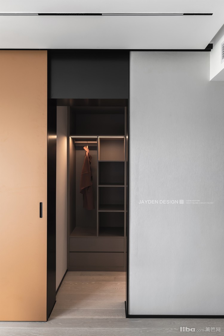 衣帽间配置的意式肤感皮质移门来自 IRON•PLUS 朝鐵极窄系统内门,有着非常完美的质感。