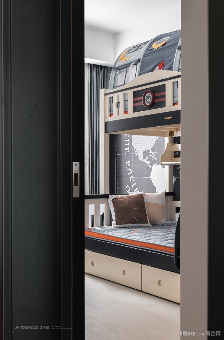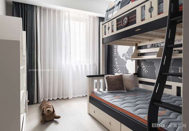 儿童房的设计充分关照到孩子天性好动、喜欢探索的特点,高低床靠墙摆放,腾出空间给孩子活动。