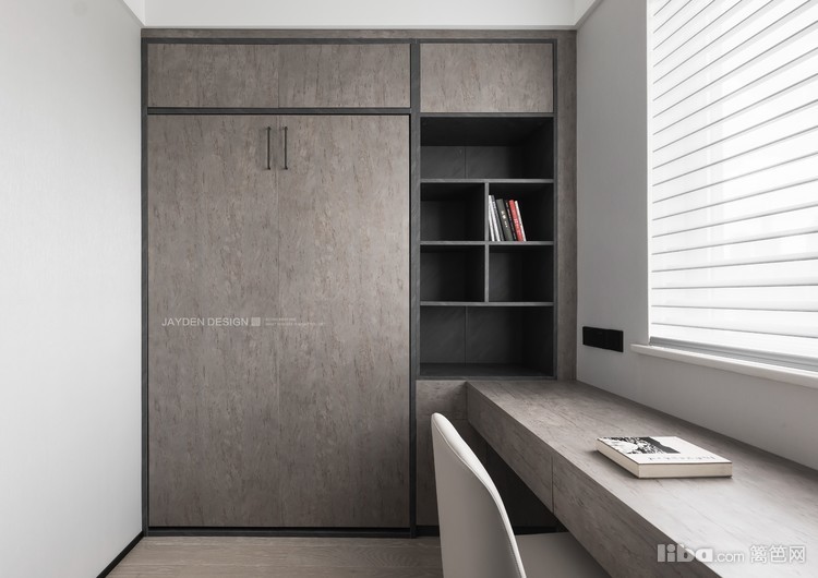 书房兼具了客房的功能,虽然借给主卧一个衣帽间的空间,但是利用过道设计的一组顶天立地的书柜,收纳量完全没有减少。