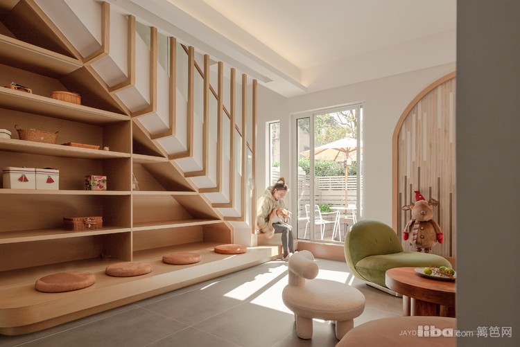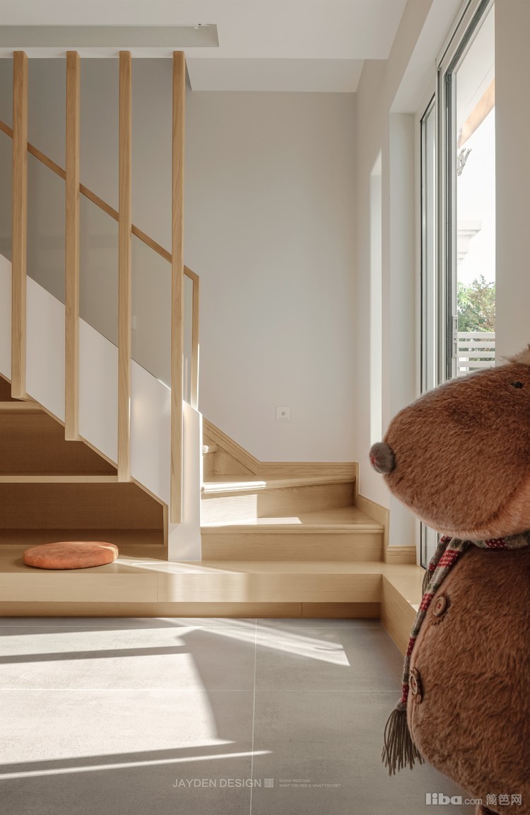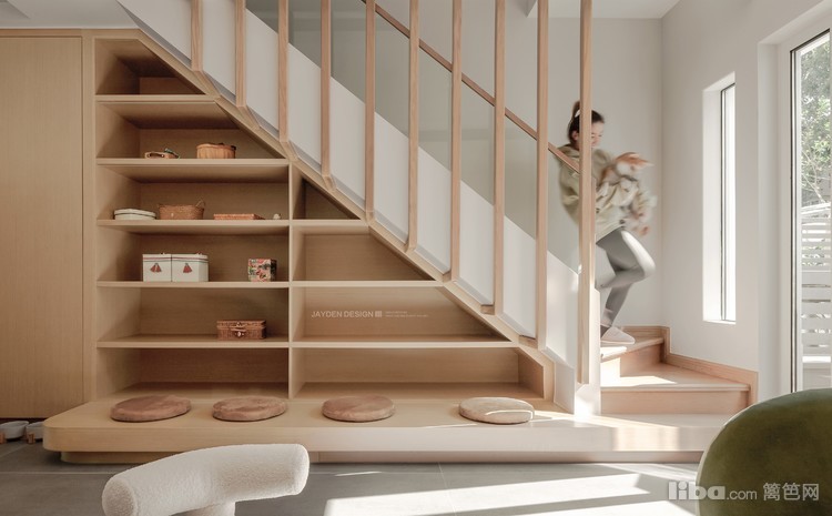 楼梯整合了电视背景、休闲和收纳功能,最大化释放空间的同时,也是将家居装饰艺术和功能属性相结合的一种方式。