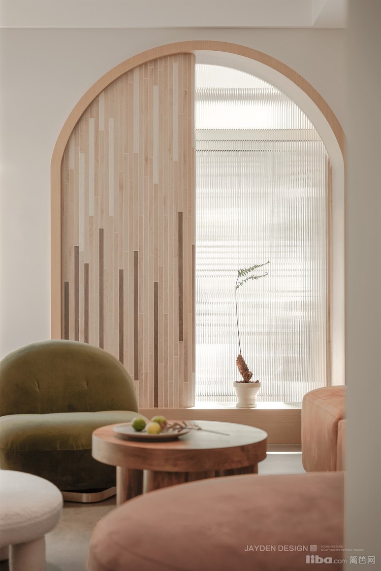 我们用拱形窗套将装饰面和窗户包装成一个整体,看上去象是拉上一半的拱形窗。