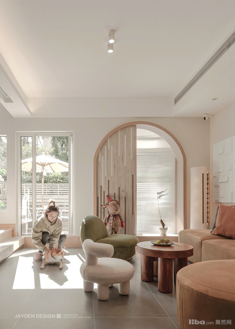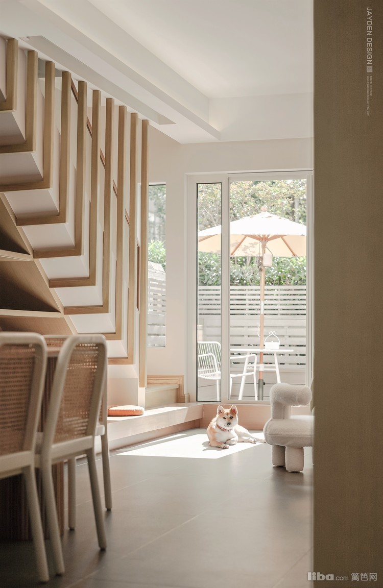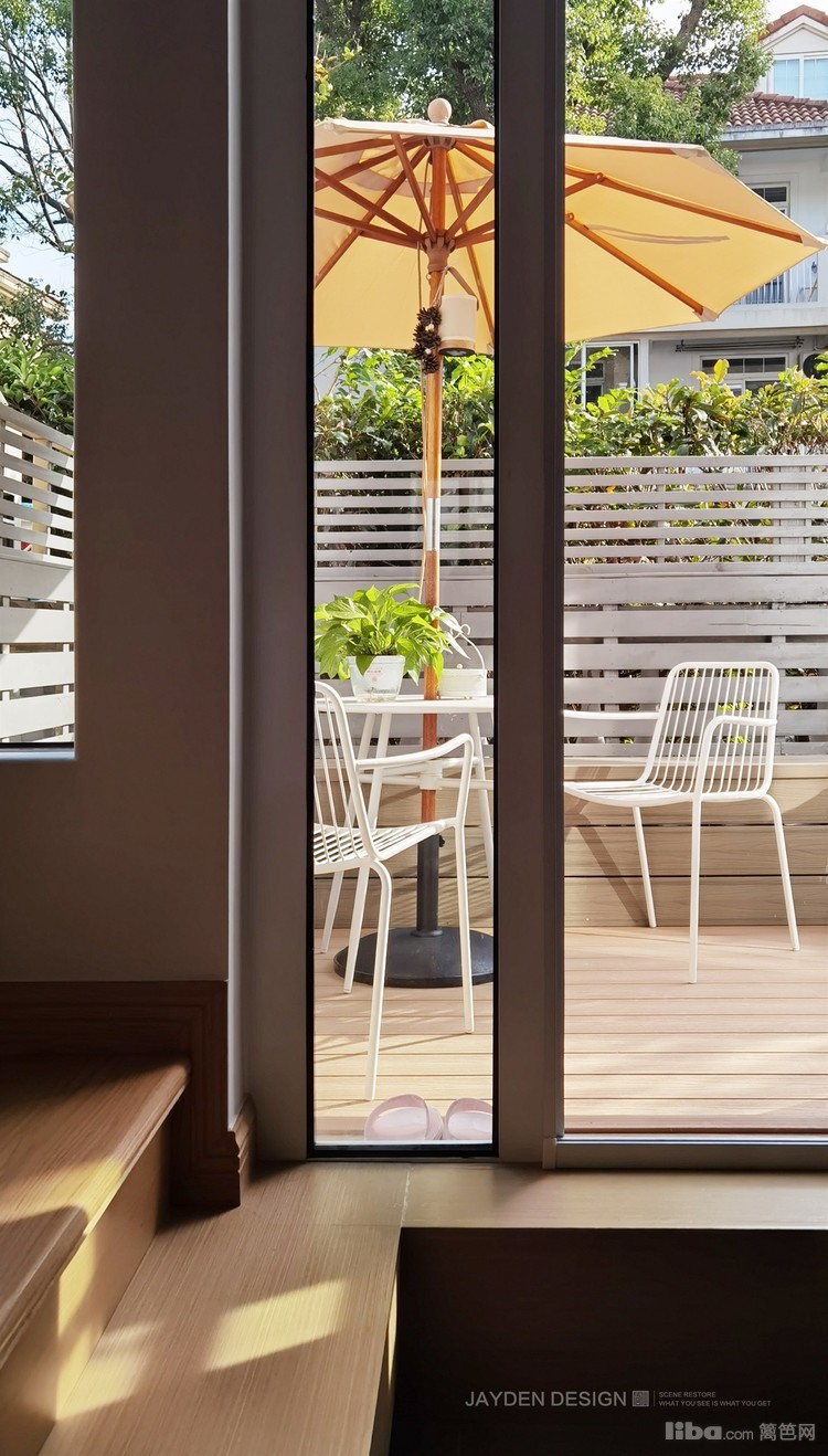 透过落地窗,窥见秋阳里的一方小小花园:白色栅栏、原木色卡座和地板……