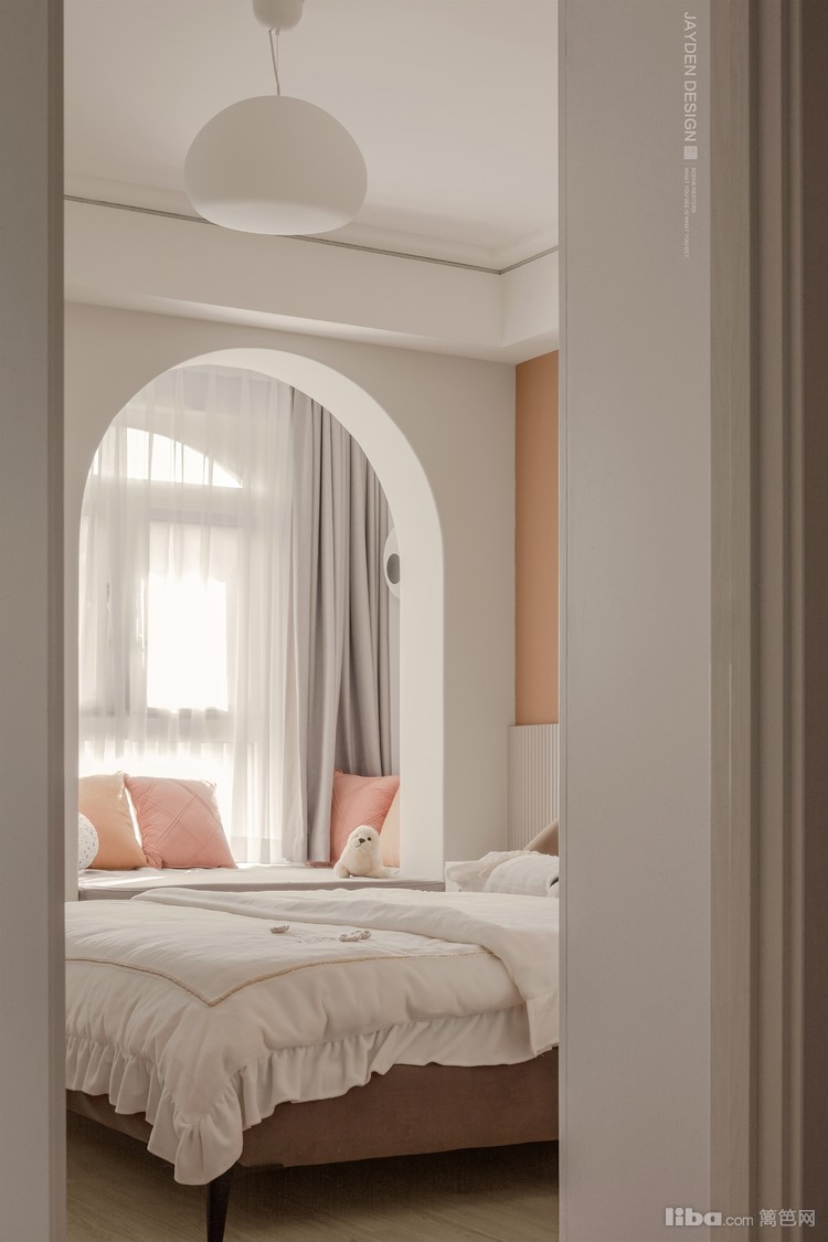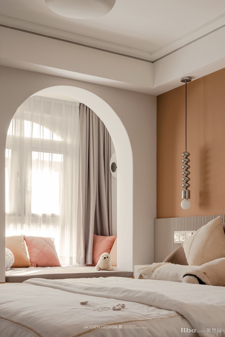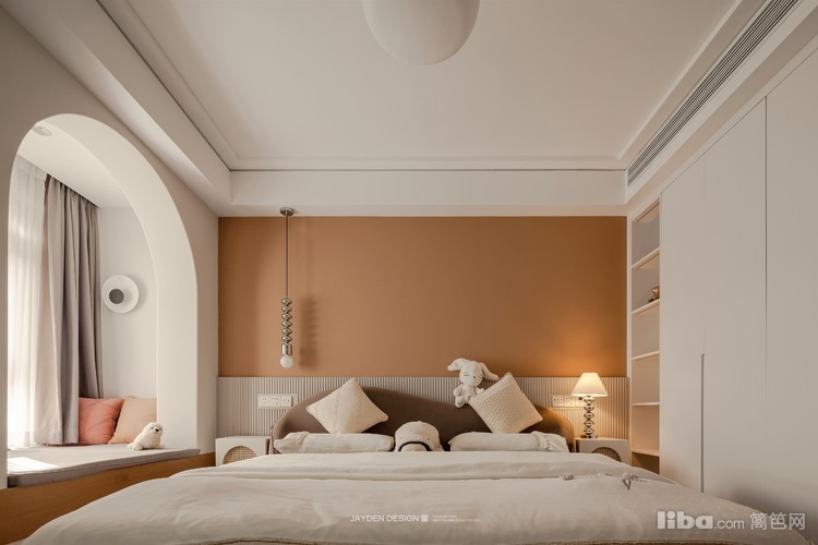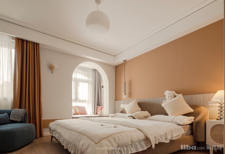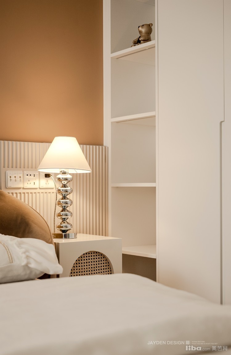 没有复杂花俏的造型,仅以简单的色彩就可以打造一间浪漫温馨的卧室。奶白色的主调下,一面粉橙色的背景,柔和雅致的搭配一眼难忘。