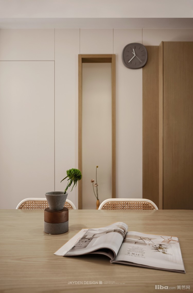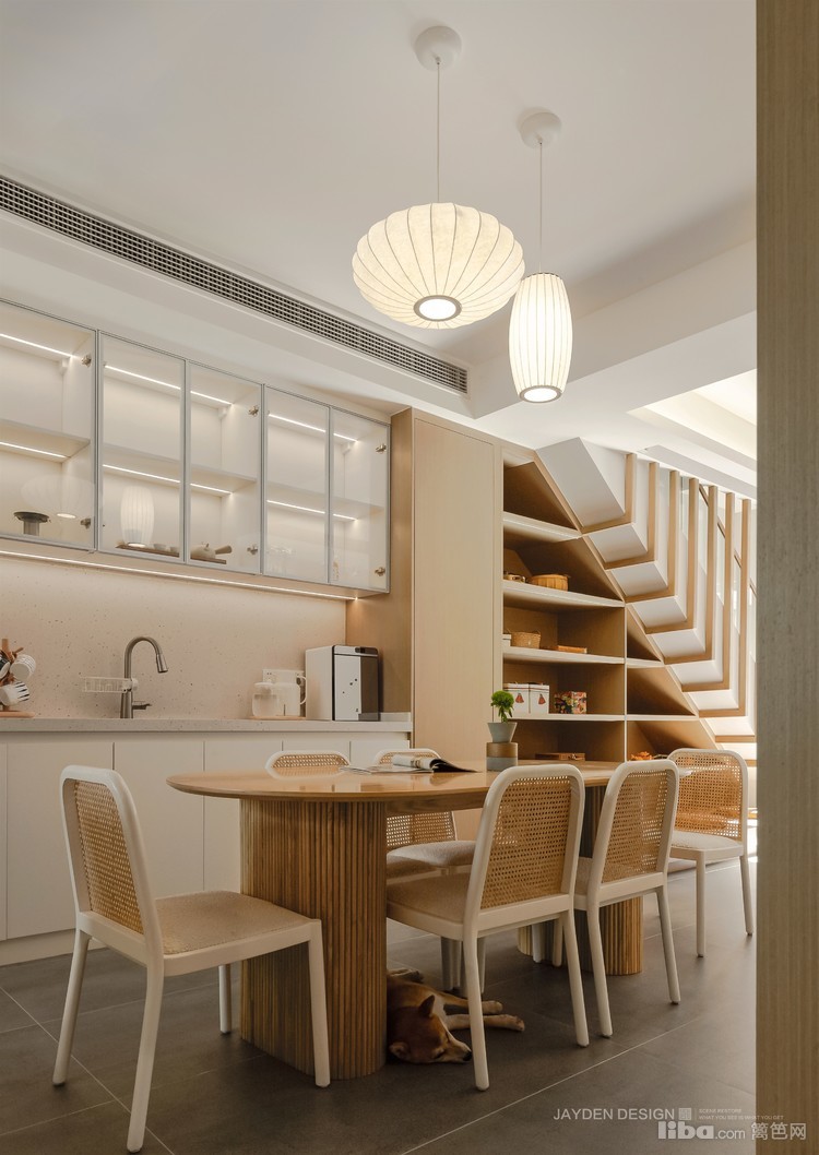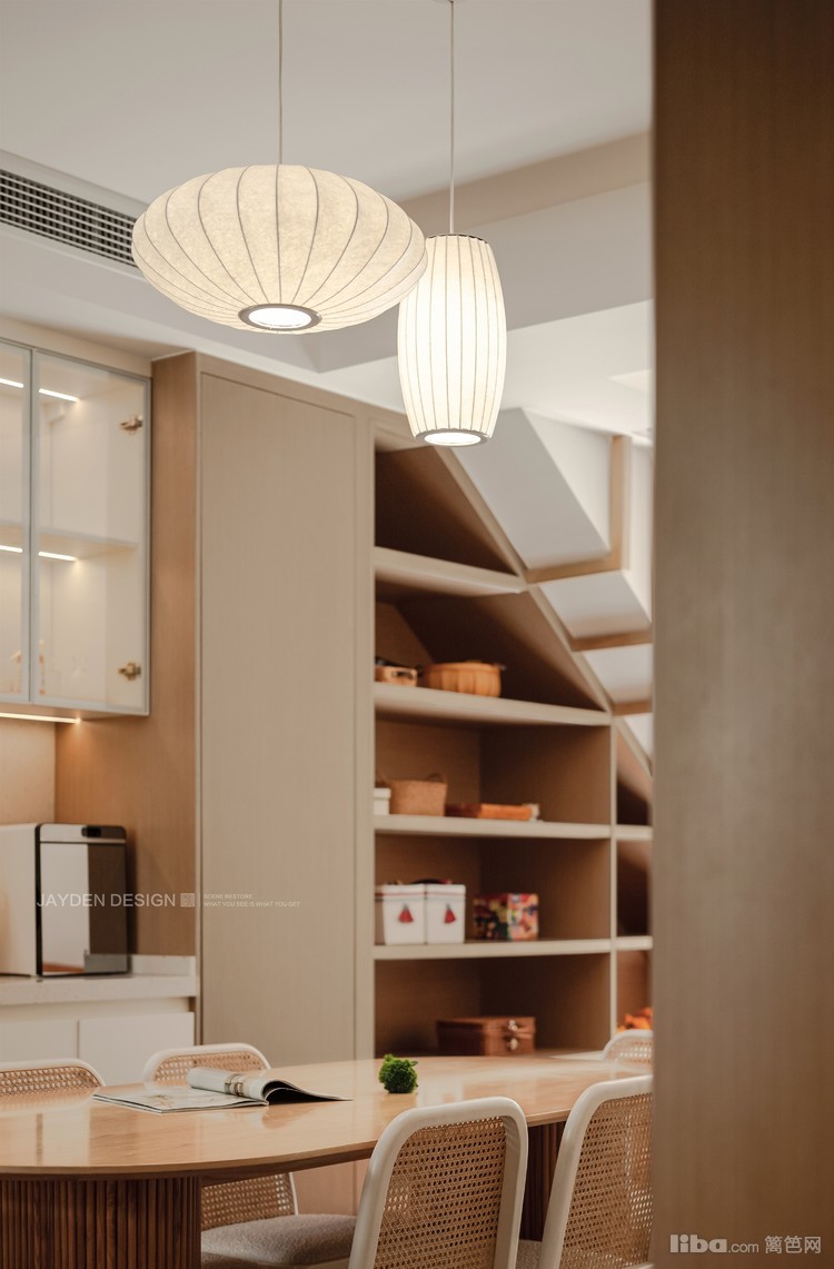 餐厅位于客厅与厨房之间,在一个南北通透的大空间里,视线非常开阔。原木和奶白色的搭配,配上经典的日式吊灯,营造出温暖柔和的用餐氛围。