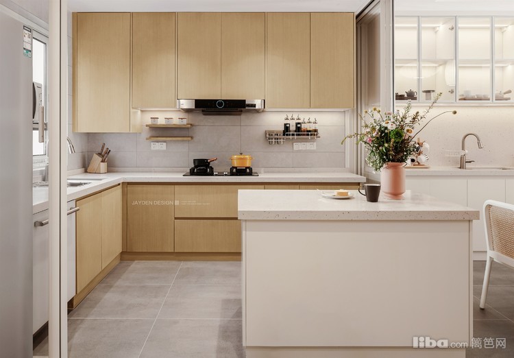 厨房两侧做了联动移门,这种可开可合的形式,完全解决了油烟问题,但又不损失通透感。