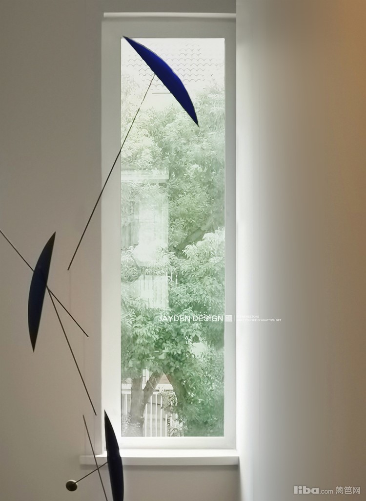 利用了墙上的条窗来造景,明艳的阳光肆意洒在木质楼梯上,湛蓝的帆船吊灯在风中徐徐转动……
