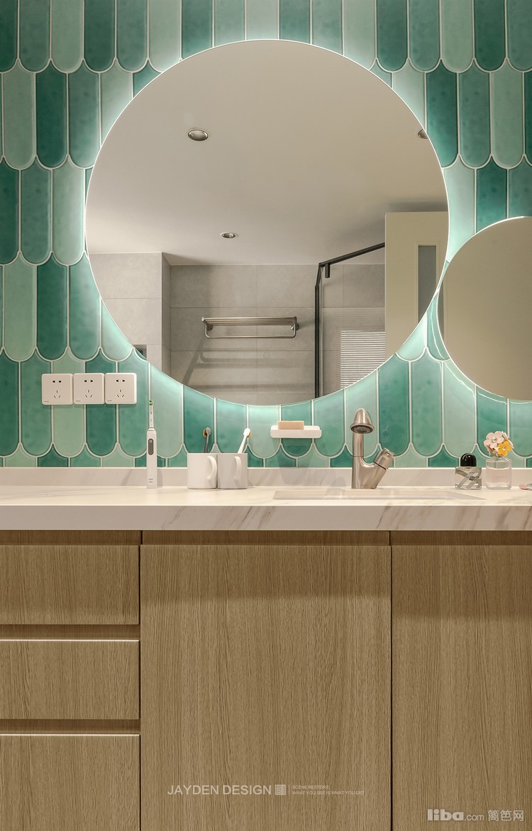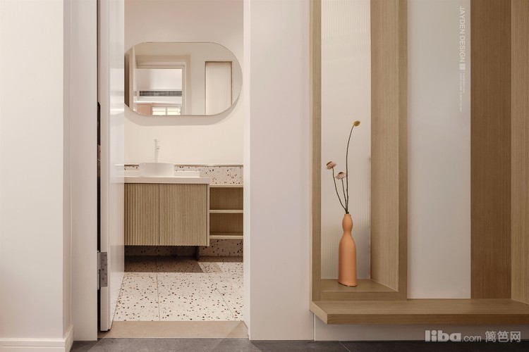 仿水磨石的小花砖,原木系的台盆柜,依然是奶白色的主调,公共卫生间保持了和客餐厅一致的整体感。