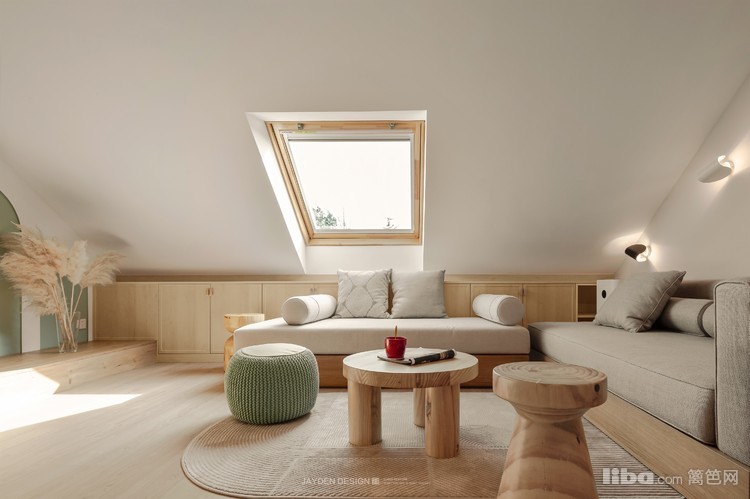 朝南的天窗下设计了一组卡座沙发,白天享和风暖阳,夜晚赏星辰皓月,好不惬意。