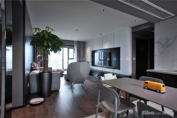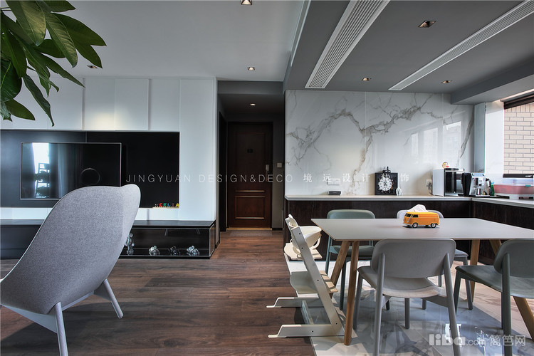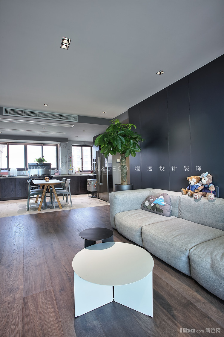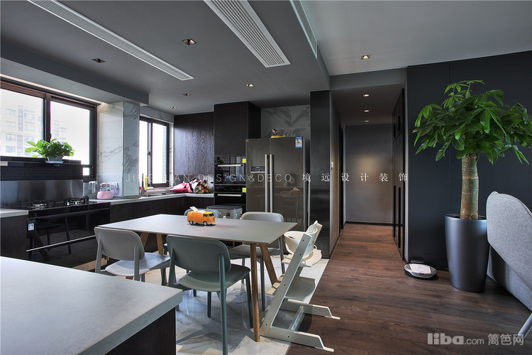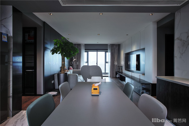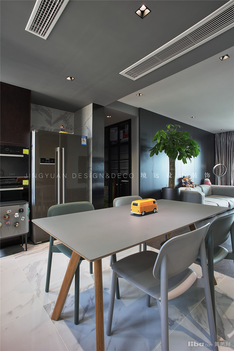 客餐厅整体以灰白黑为主,整个空间灯光采用了无主灯的方式,尽显沉稳和干练。