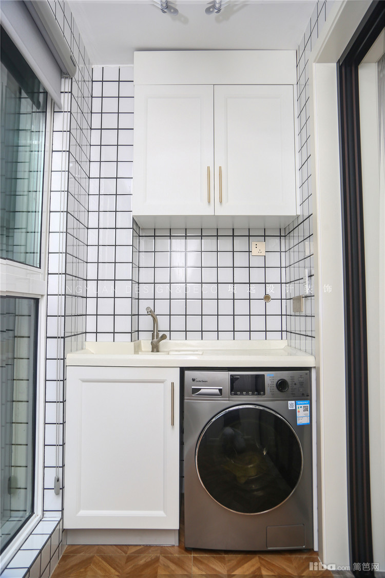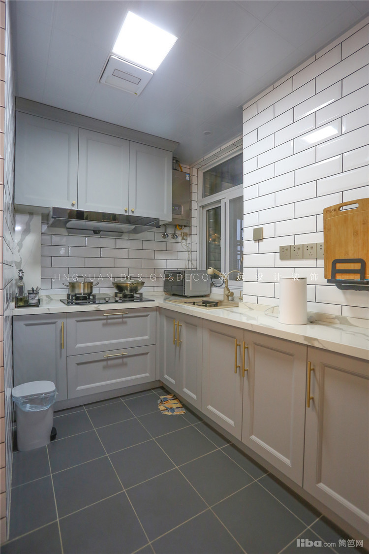 厨房墙面采用了网红小白砖+灰色橱柜,配置了金铜色拉手,隐隐透出一股轻奢的格调。