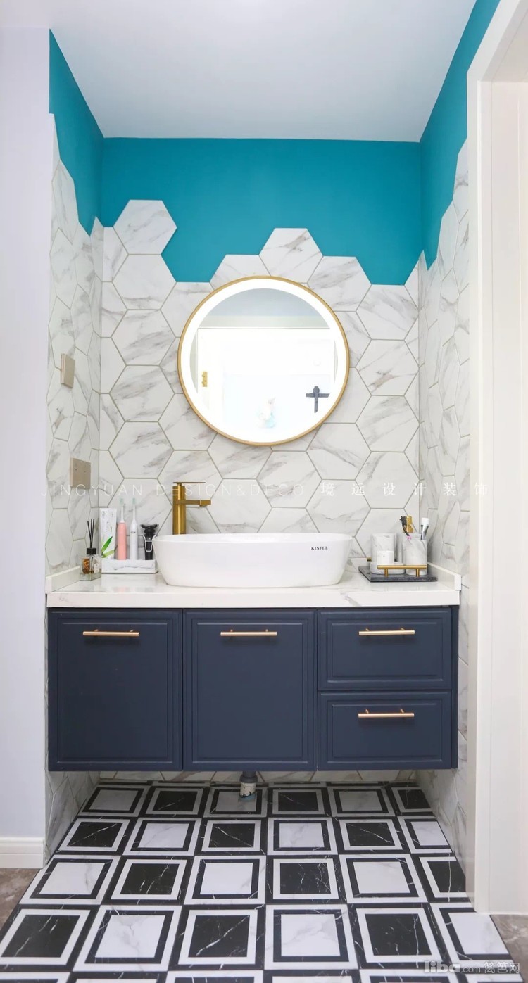 卫生间墙面铺贴的大理石纹六角砖与蓝色乳胶漆相交错,呈现出不一样的美感。