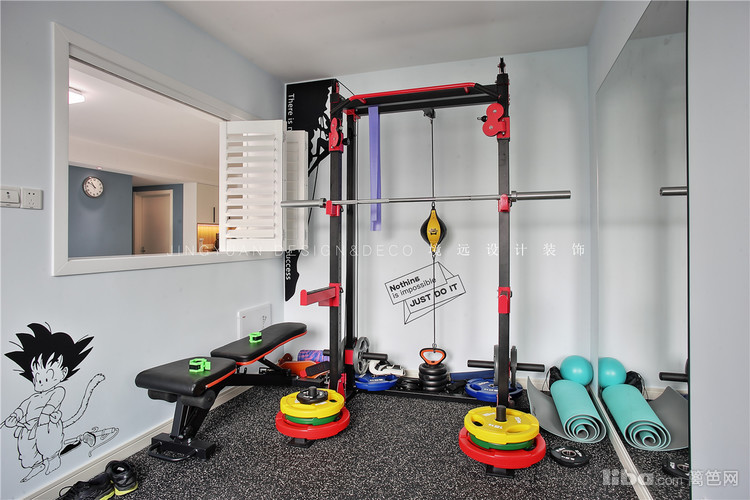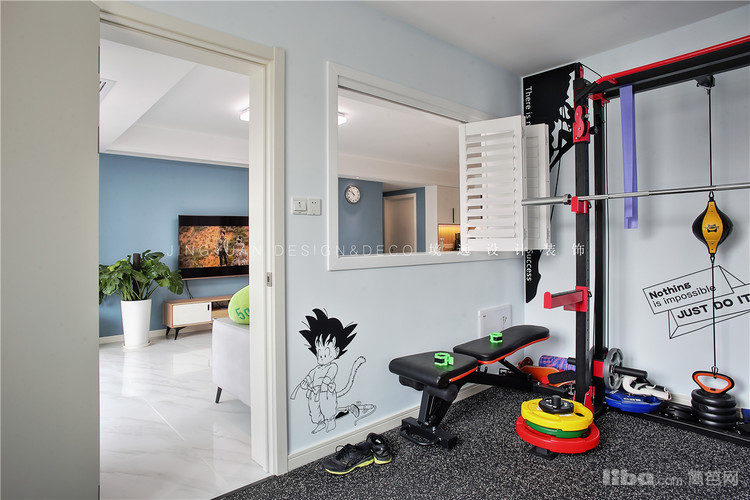 面积不大的健身房,墙面设计成折叠窗,视觉得到了充分的延伸和扩大;