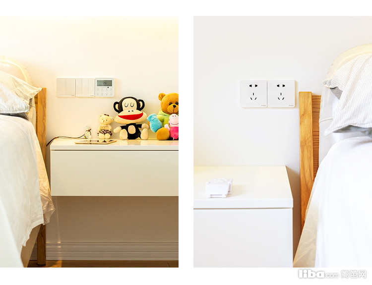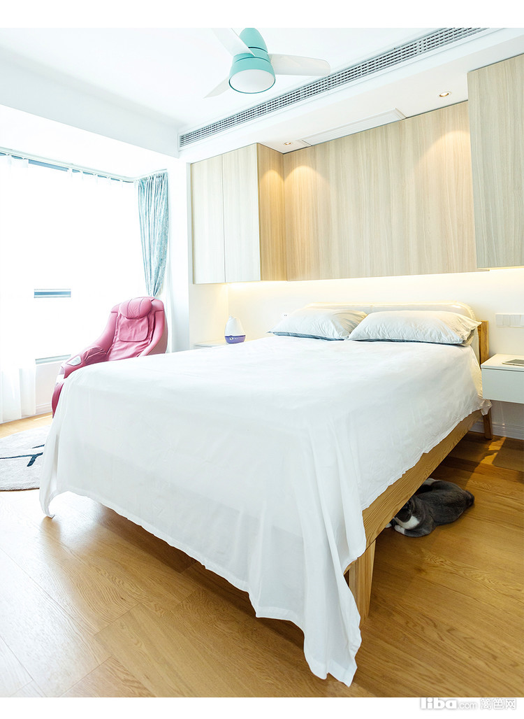 白色系的卧室,通透感强。吊柜色设计增加了收纳空间。暖灯的设计减少了白色系的凌冽,增加了几分暖意。
