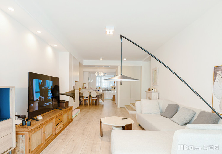 客厅和阳台之间,选择了直接打通,做了拱形的阳台门洞+通铺木地板,门洞下方放了一个小猫咪的家。