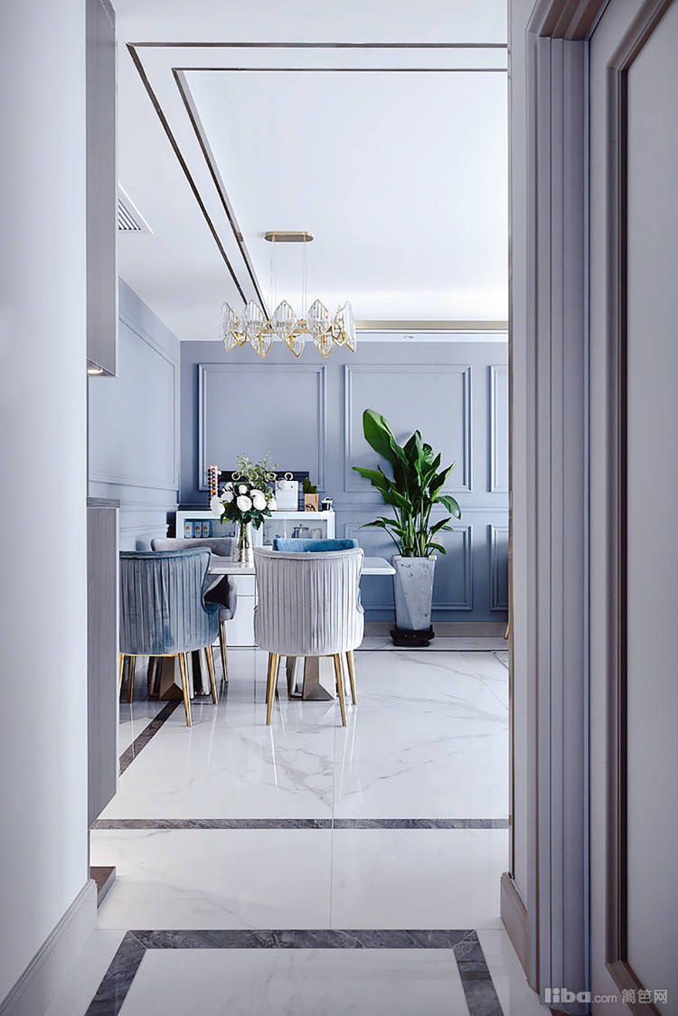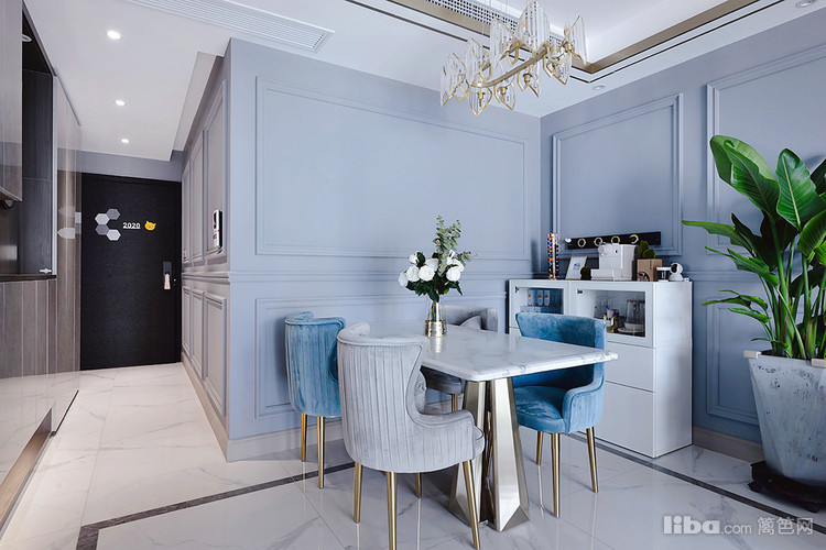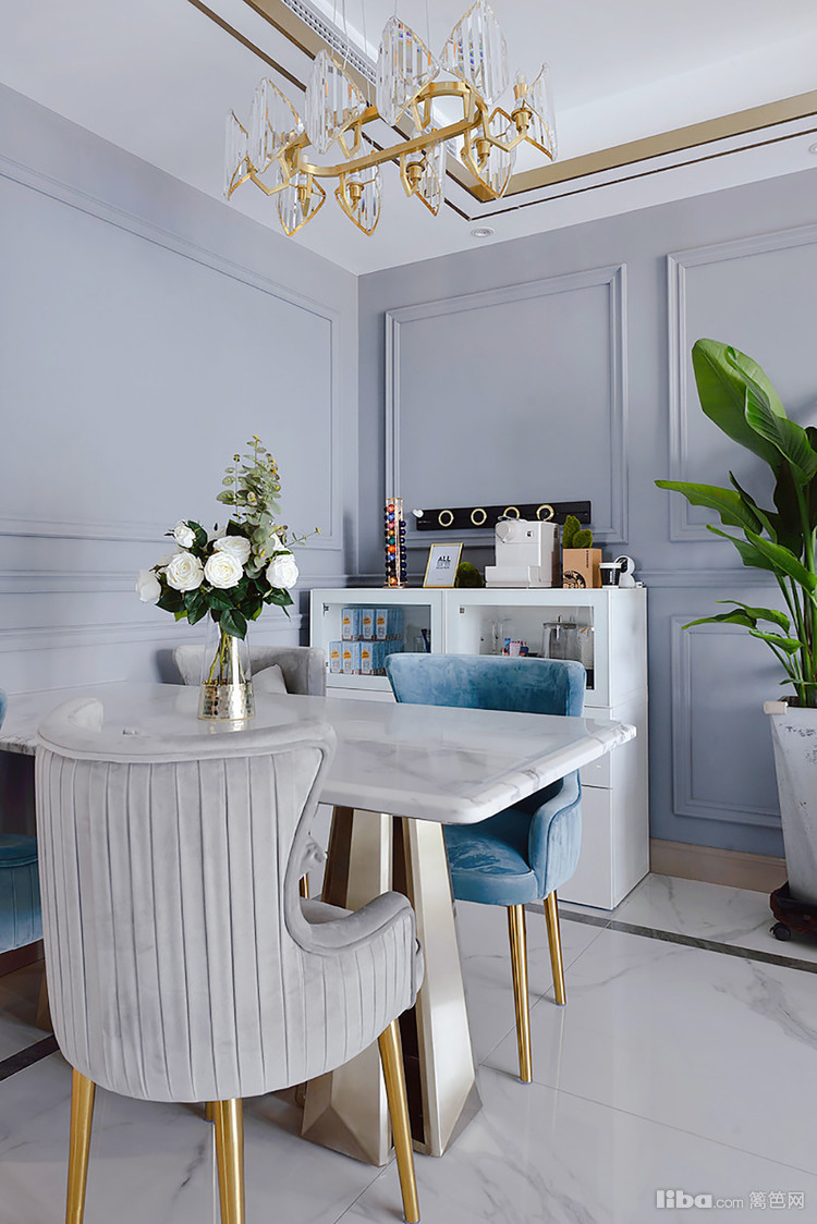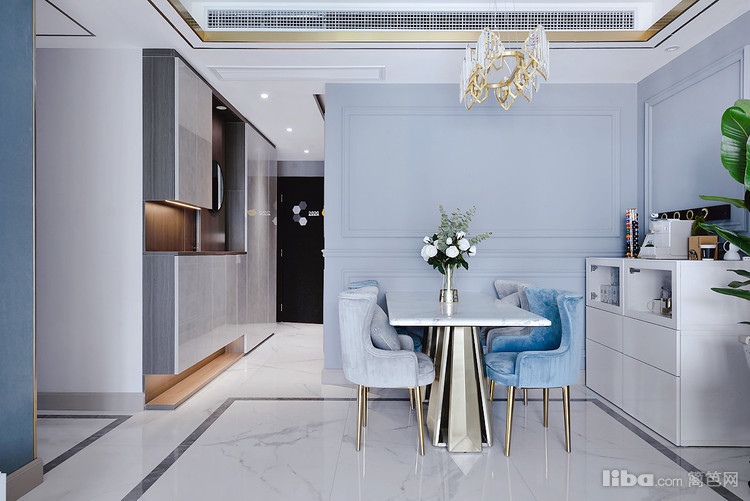 玄关左手边就是餐厅。餐桌桌面选择了白色,配上绿叶白蔷薇,提亮了这处空间,视觉上更明亮,又增添了生机感和素雅感。蓝色和灰色的绒布餐椅,坐在这吃饭十分舒服。