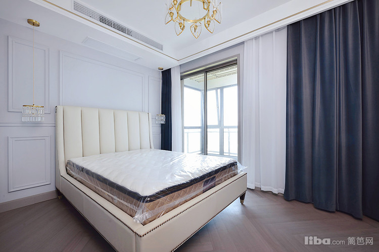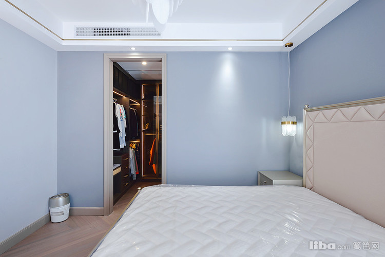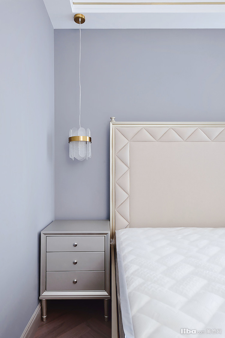 主卧墙面刷的雾霾蓝色乳胶漆,配上白色天花板,加上房间内的金色家具元素,轻奢华丽感油然而生!