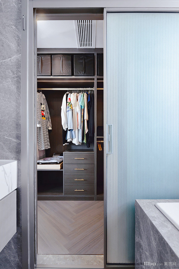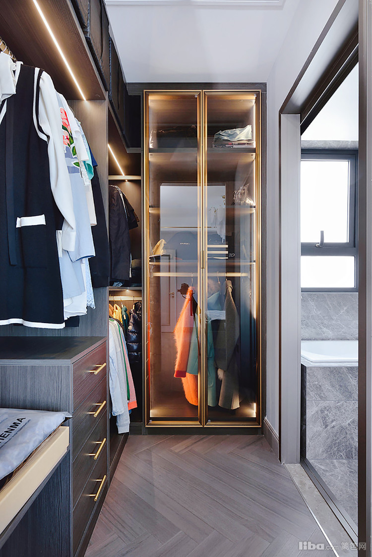 从主卧卫生间出来就是衣帽间,衣帽间同样位于主卧内。一整套的胡桃木衣柜,内敛有格调!