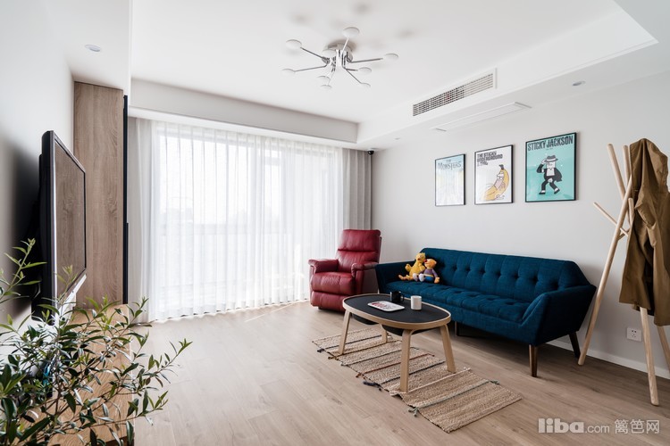 湖蓝色的简约沙发,大红色沙发椅,让空间多了一份不一样的色彩。顶天立地的玻璃柜,收纳更多玩偶。