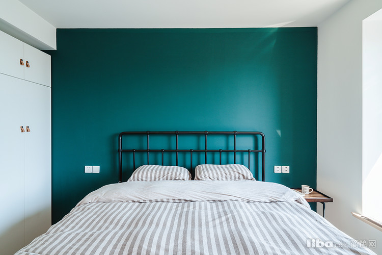 这里就是主卧啦,放眼忘去简约干净,又不失情趣。没有吊顶,空间高度不受影响,空间也会开阔。黑色铁艺的床架自带时尚感,搭配绿色的孔雀绿背景墙,时尚又复古。
