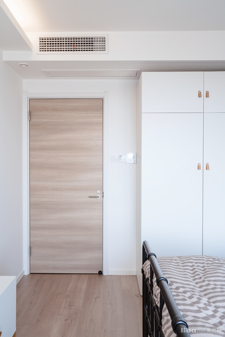 衣柜和主卧的一样,简洁的白色搭配皮质的把手很特别,颜色与大白墙接近,空间更显大,收纳能力强。