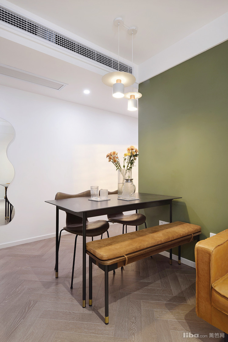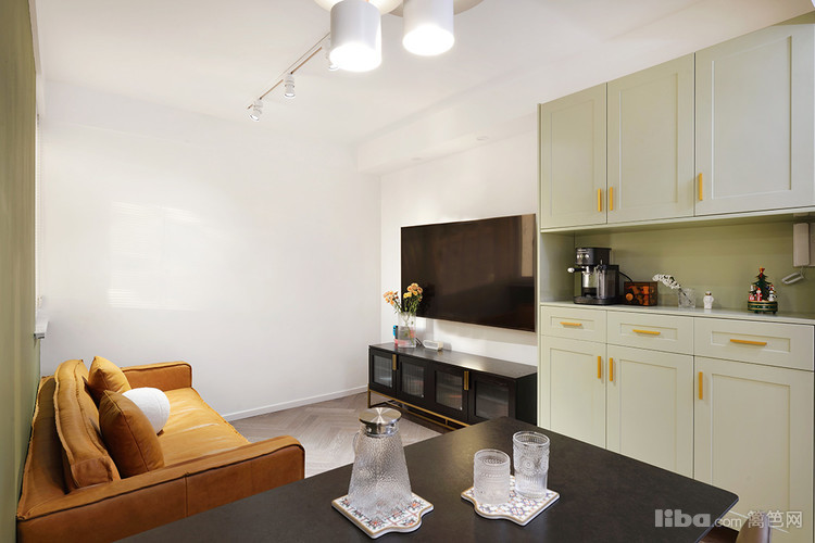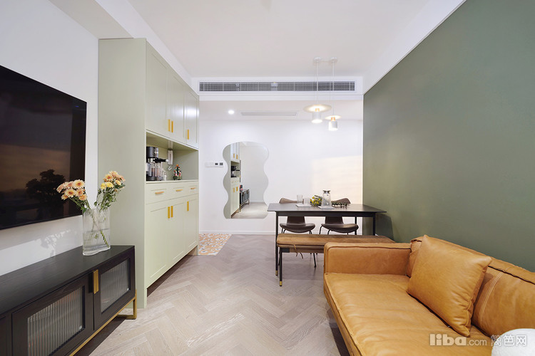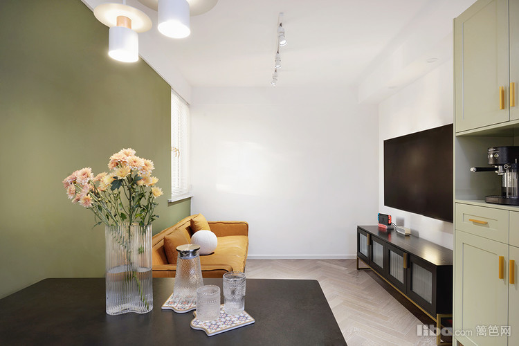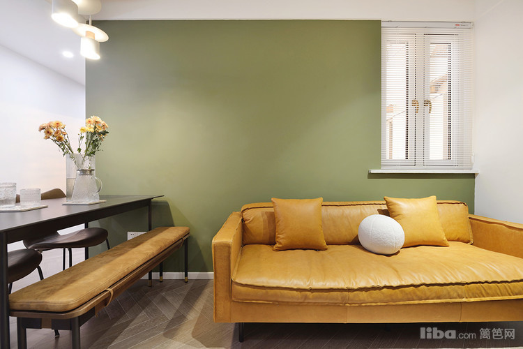 客厅这面豆绿色的墙越看越喜欢,搭配焦糖色沙发又有一种优雅的复古感,一整个绿野仙踪的家呀。