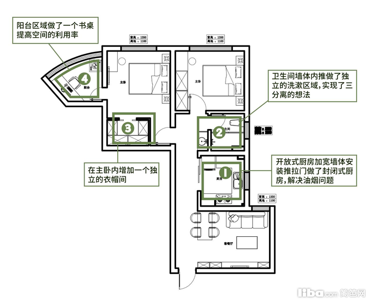 改造后:洗漱区外移,洗漱区外移,干区湿区完全分离互不打扰,主卧衣柜区域打造了一个独立的衣帽间