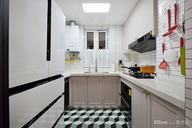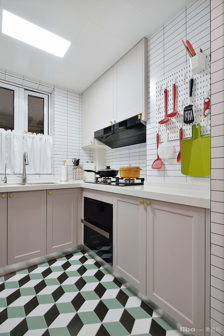 为了区别传统厨房的单调属性,我们在地砖的选择上也下了功夫,放弃大规格墙地砖,采用3d的复古绿花砖为空间进行点缀,这样的厨房搭配既凸显质感的同时又起到了空间延申的作用。