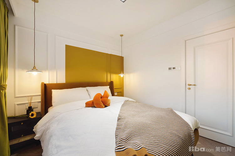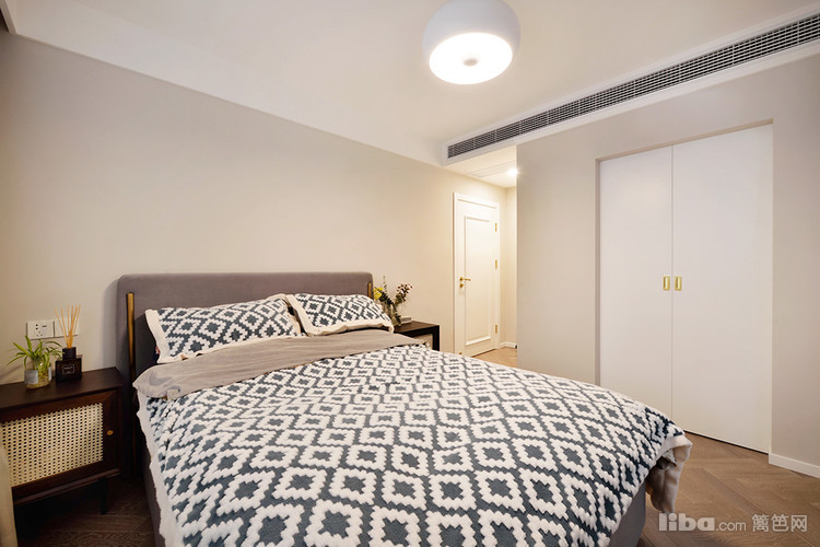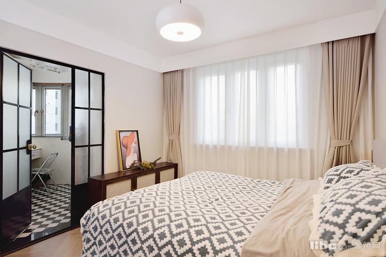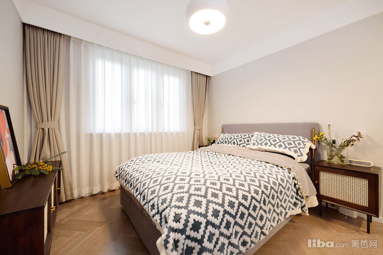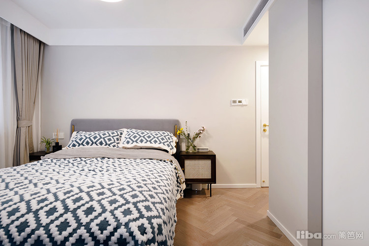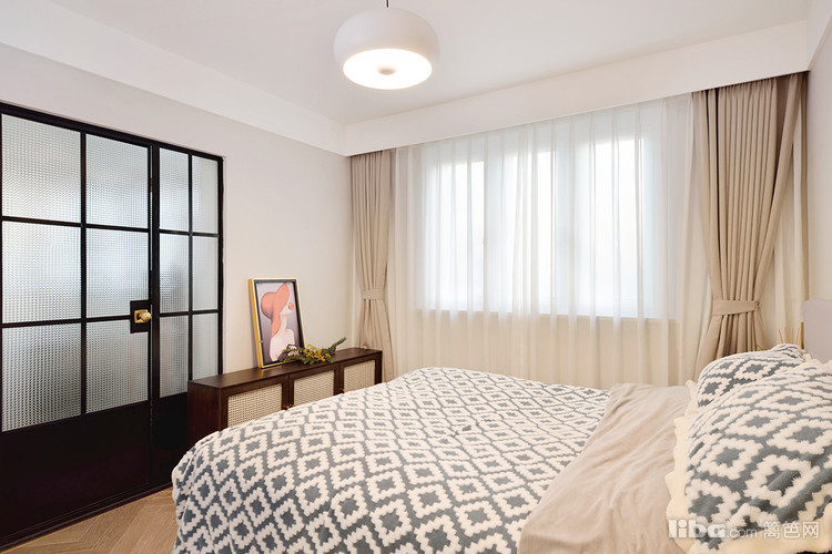 简约的搭配,喜静感满满,每到下午阳光照射,透过纱窗,仿佛时间在这里按下暂停键。人字拼的木质地板,核桃木床头柜,简约法式的气息。核桃木和奶白的藤编拼接,复古中有些小浪漫。
