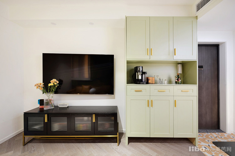 电视柜复古的烟熏黑与金色搭配。钢化玻璃柜门抗压能力是普通玻璃的3~5倍,即可以遮挡杂乱又有通透感。