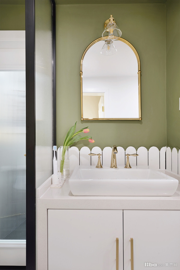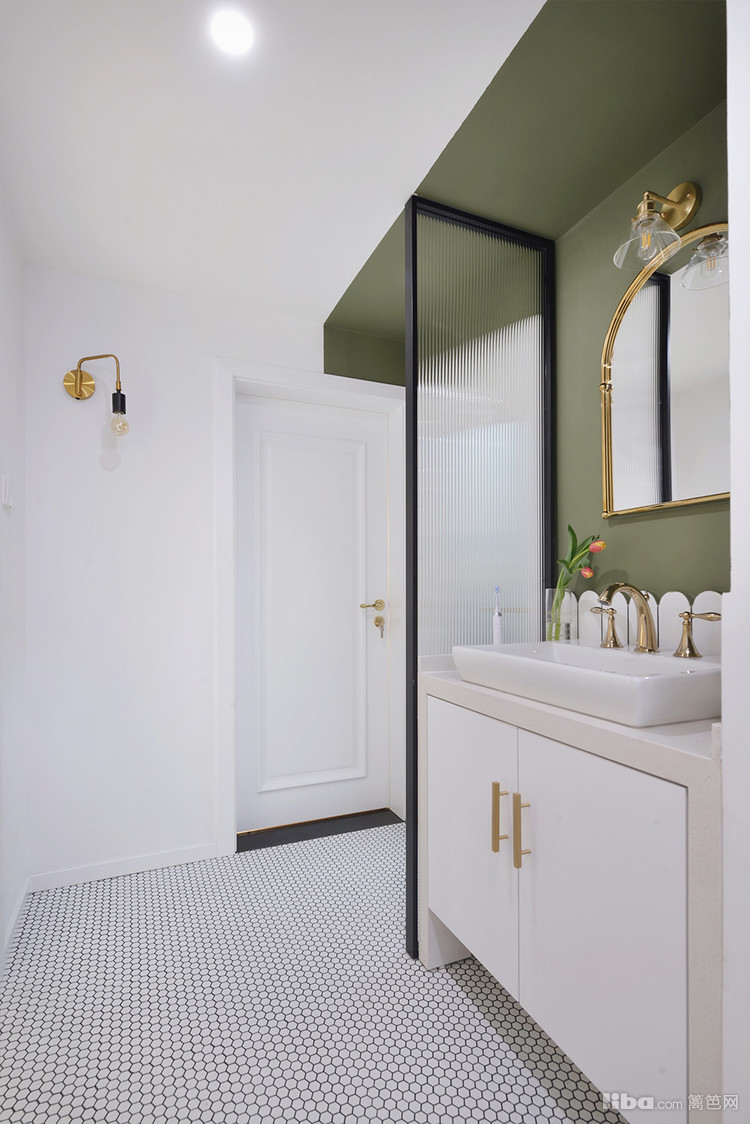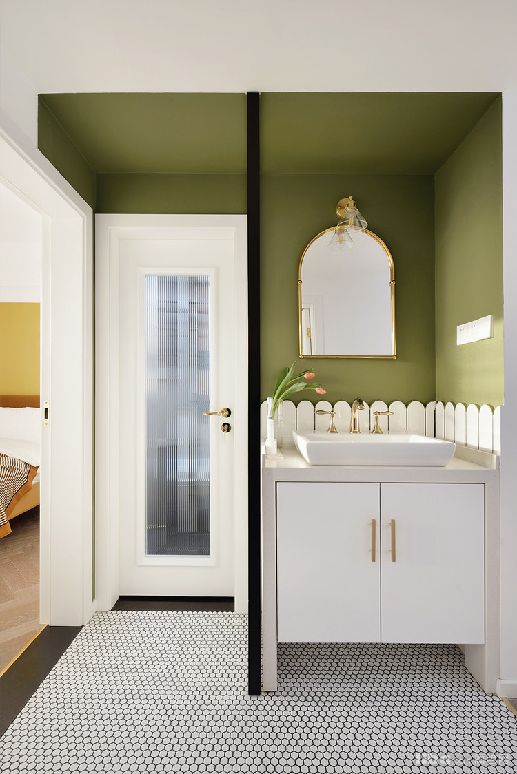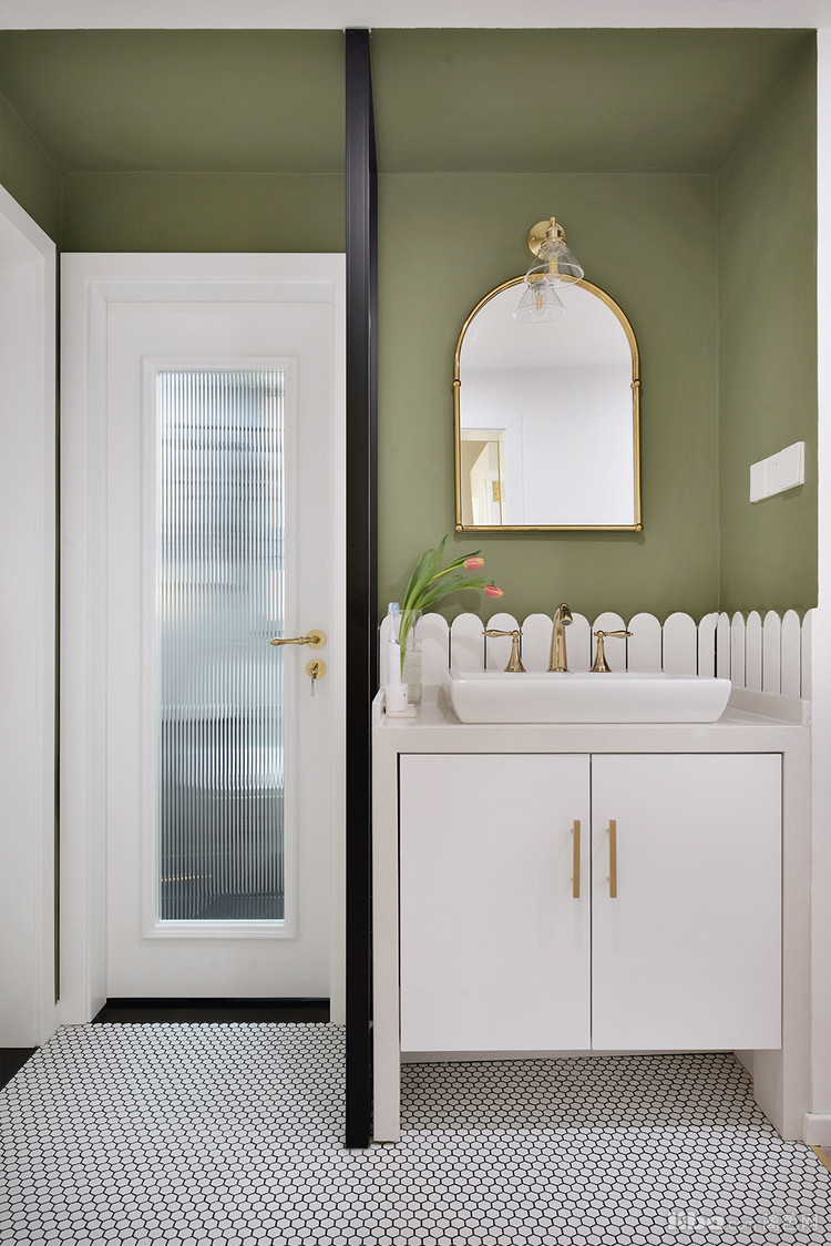 走过走廊就是卫生间区域,利用金色踢脚线和瓷砖和厨房划分区域。无主灯设计让空间不压抑,金属壁灯提高氛围感。绿色和白色墙漆拼接,空间更有层次感同时使洗漱视觉空间聚焦。