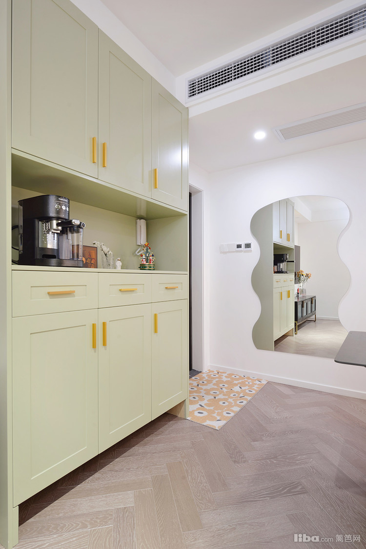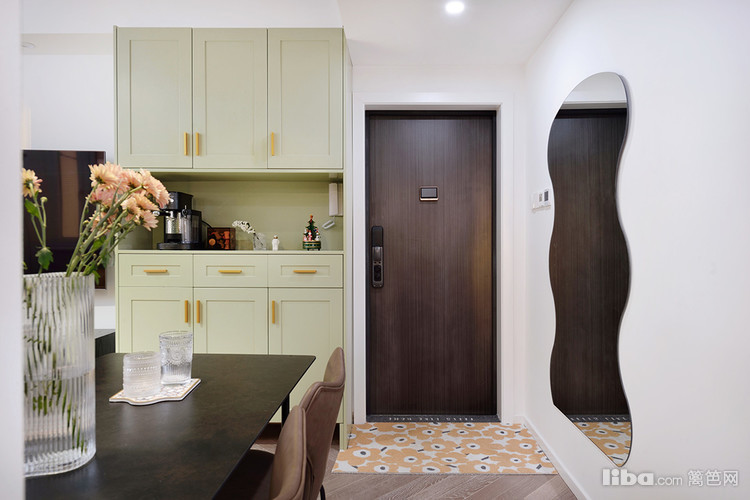 左边上墙的异形穿衣镜,有立体感,穿好鞋在门口照镜子很方便,可以每天早上打卡ootd,开启一天好心情。