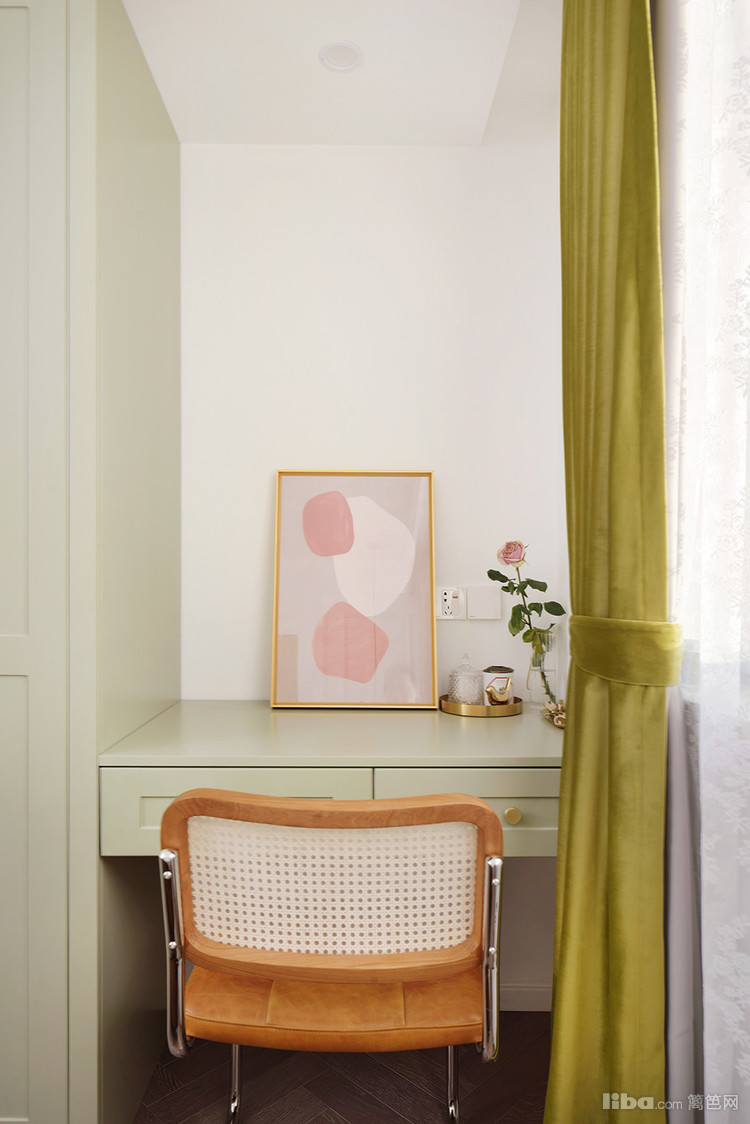 豆绿色的衣柜和化妆柜一体设计,悬空设计打扫方便放置化妆椅子,抽屉可以收纳化妆品,桌面看起来干净清爽。