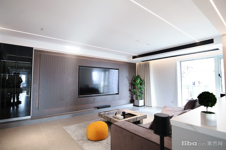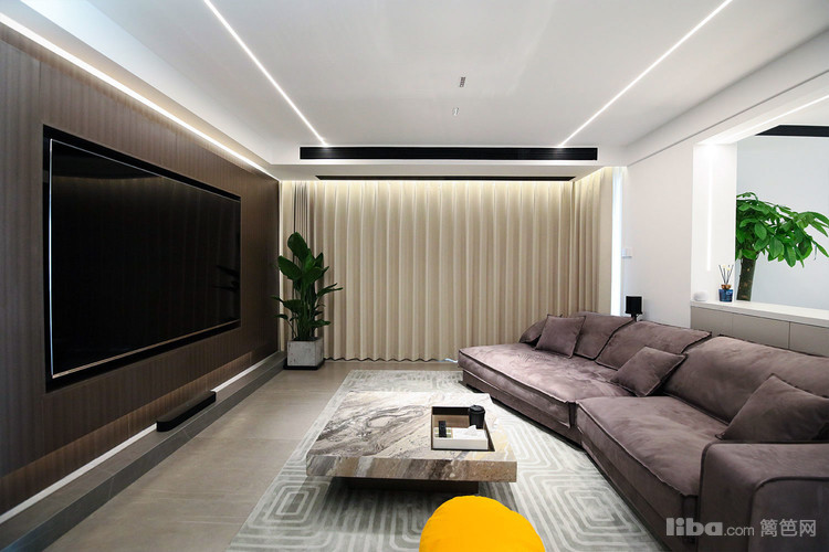 客厅用无主灯,营造通透、温馨的休闲空间。将电视内嵌至整个背景墙里,提前隐藏布置好线路。