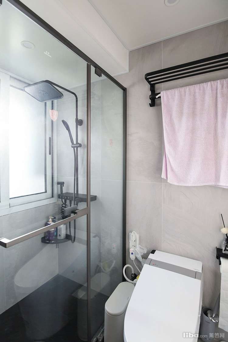 往里走就是客卫,这里之前是厨房和储物间。现在改造成客卫,干湿分离,左边是淋浴区,右边是电动马桶,这里一定要记得安装插座,不然马桶都没地方插电。