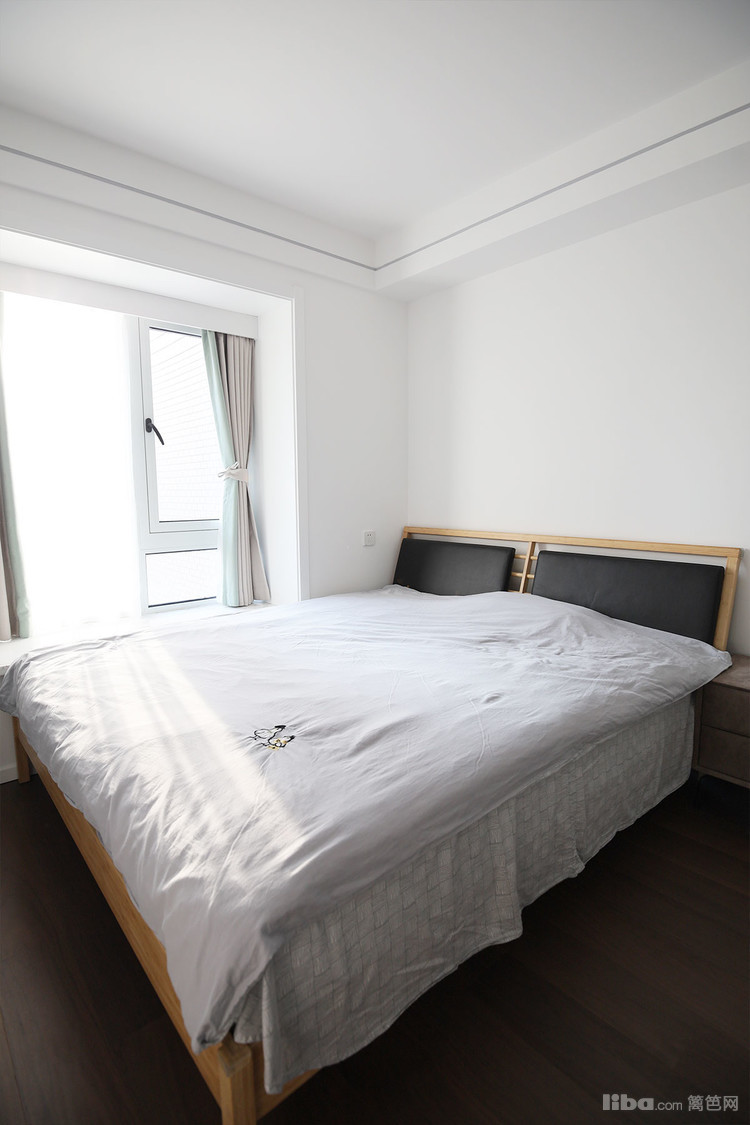 次卧是同样绒布质感的床头柜,搭配木地板自带温度。拉开窗帘,阳光洒进来,瞬间暖洋洋的。