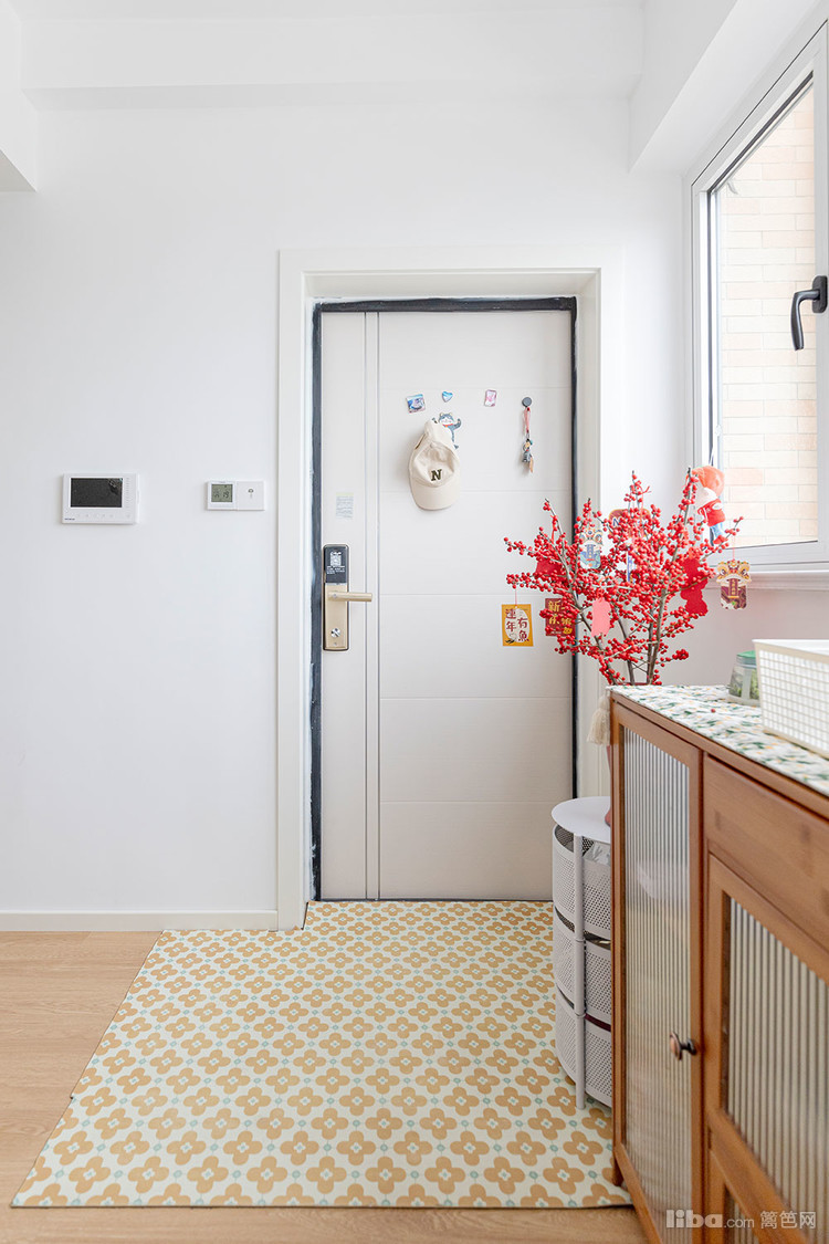房子是一梯一户的,玄关柜放在外面。入户进门,看到黄色的小花地垫和喜庆的新年装饰花束,洋溢着生活的气息。